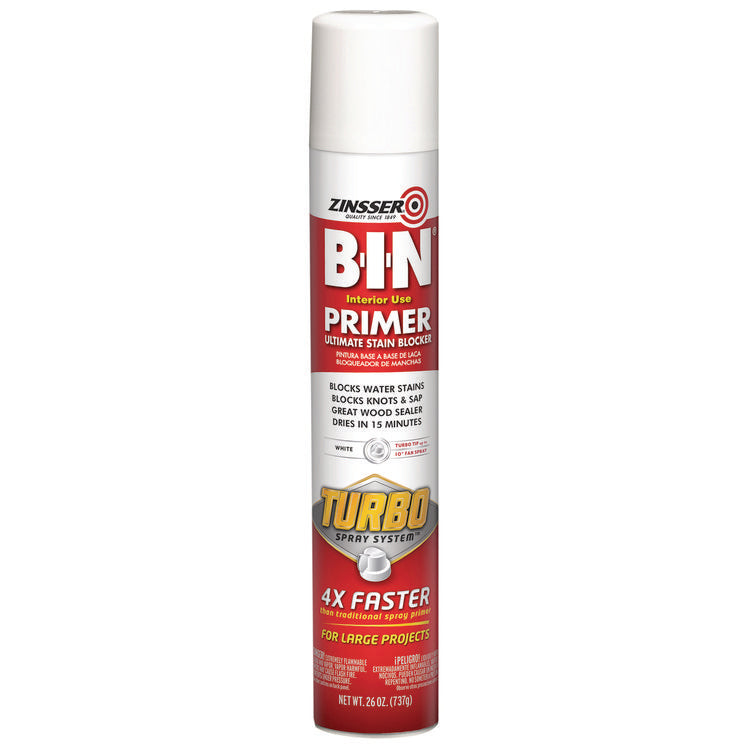 Get the speed and quality of professional spray systems without the hassle. BIN Aerosol Primer with Turbo Spray System combines the power of BIN primers with the speed and convenience of the Turbo Spray System. Always great for blocking stains and odors associated with water-, smoke- and fire-damage, BIN professional primers are uniquely suited for disaster restoration jobs. As they block odors from pets, mildew and cigarettes, they're perfect for a wider variety of specialty painting projects, too. For added versatility, they also employ shellac and rosin binders, which easily sand to a powder when dry, allowing BIN primers to double as excellent wood sealers. The proprietary Turbo Spray System delivers a wide, 10" spray pattern and four-times the output of traditional primer sprays, ensuring fast and easy full coverage. For best results, hold can upright 18 to 24 inches from the intended surface, and spray in a steady back-and-forth motion, slightly overlapping on each stroke. Paint Sub-Category: Primer; Spray Paint; Solvent-Based; Intended Application Environment: Interior; Finish/Sheen: Flat; Color(s): White.