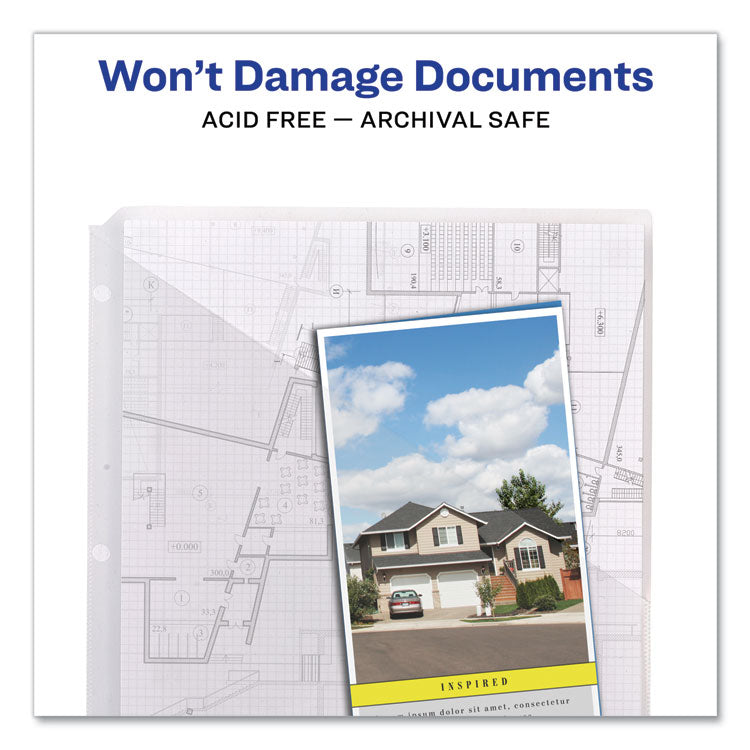 Durable, see-through pockets keep binders neatly organized. Ideal for long-term storage, non-stick polypropylene material is acid free and won't lift print. Each pocket holds up to 20 insert sheets and fits in standard three-ring binders. Color(s): Clear; Height: 11"; Width: 9.25"; Quantity: 5/Pack.