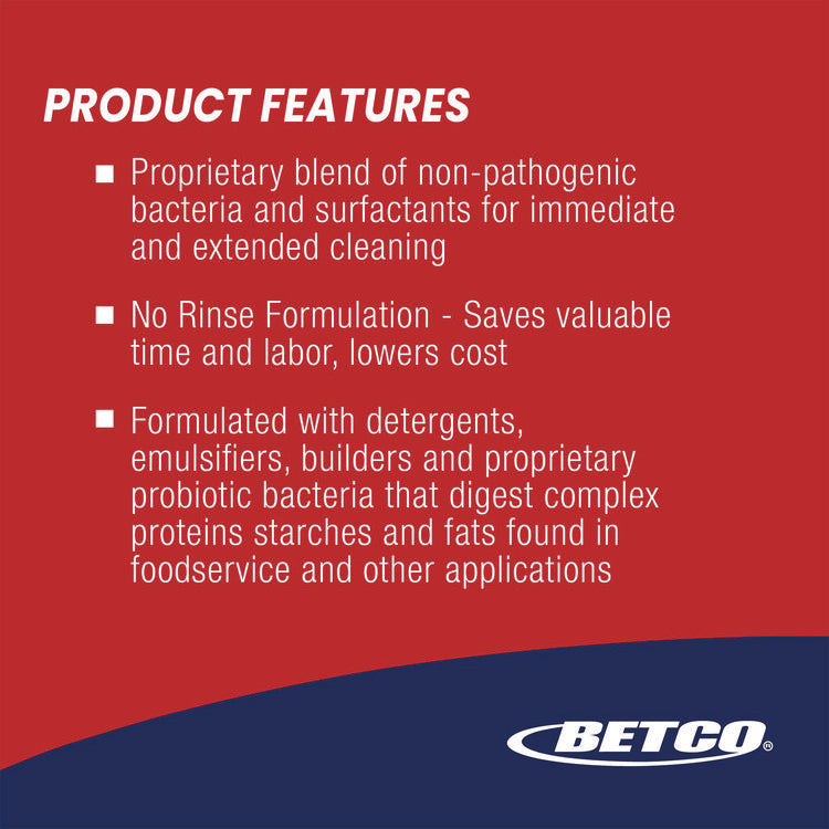 Green Earth BioActive Solutions™ No-Rinse Floor Cleaner is uniquely formulated with detergents, emulsifiers, builders, and proprietary BioActive non-pathogenic bacteria. This combination digests complex proteins, starch, and fat found in foodservice and other applications. Saves on labor as it eliminates the need to rinse. The non-pathogenic bacteria continue working even after the floor is dry. With regular use it improves traction resulting in a cleaner, safer work environment. Application: Floor Cleaner; Applicable Material: Hard Floor Surfaces; Chemical Compound: Alkyl Polyglycoside; Dirt Types: Dirt; Oil; Grime.