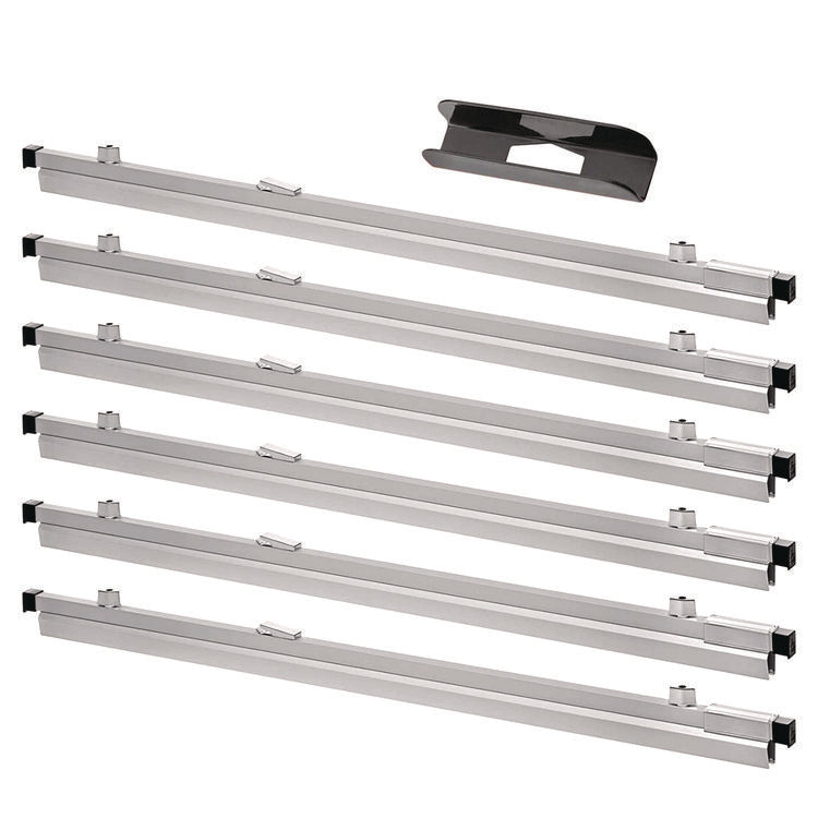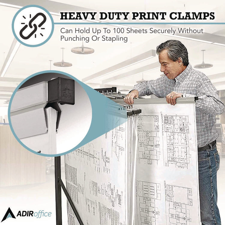 AdirOffice Blueprint File Hanging Clamps are a perfect way to organize important files. Made specifically for blueprints, plan drawings, layouts, maps and other large-format documents, they are designed to hold those large documents safely and securely. Expertly made using strong, sturdy aluminum with solid steel, silver wing knobs, these clamps are soundly durable to provide long-lasting strength and use for years to come. The jaws on each clamp open to 1" wide to effectively clip and hold all your files together, and can accommodate up to 100 sheets or 20 pounds. The right hanging clamps are key to a filing system's effectiveness. For easy file retrieval and identification, snap-on, plastic label holders are included in the package. You'll be able to look through that huge assortment of files and locate the one you need in no time flat, making your workday more efficient and organized. You will certainly impress your audience if you plan on using these clamps to hold together documents for a presentation you're going to make. Besides providing the strength you need, they are attractive, visually pleasing and professional looking to make each presentation a success. Safely storing and holding all of your documents in one convenient place, the clamps can be used with all Adir, Mayline, Alvin, Safco, Brookside Design and Sandusky racks. Combine these clamps with a rack of your choice to meet all of your filing needs. Color(s): Silver; Rack Style: Blueprint; Mounting: Hanging; Document Size Accommodation: 36" Wide Documents.