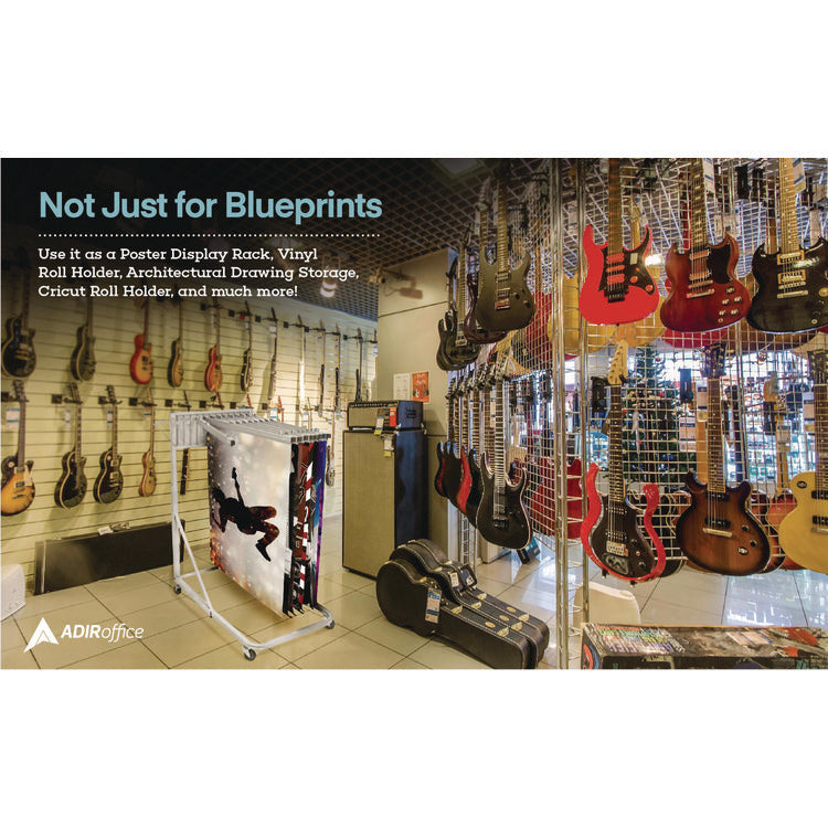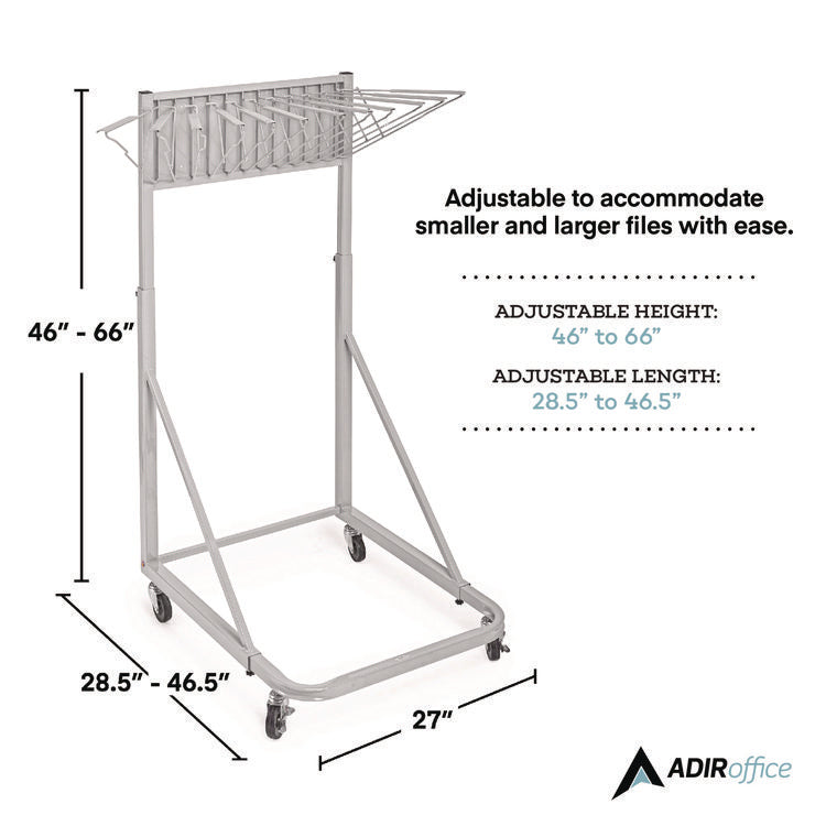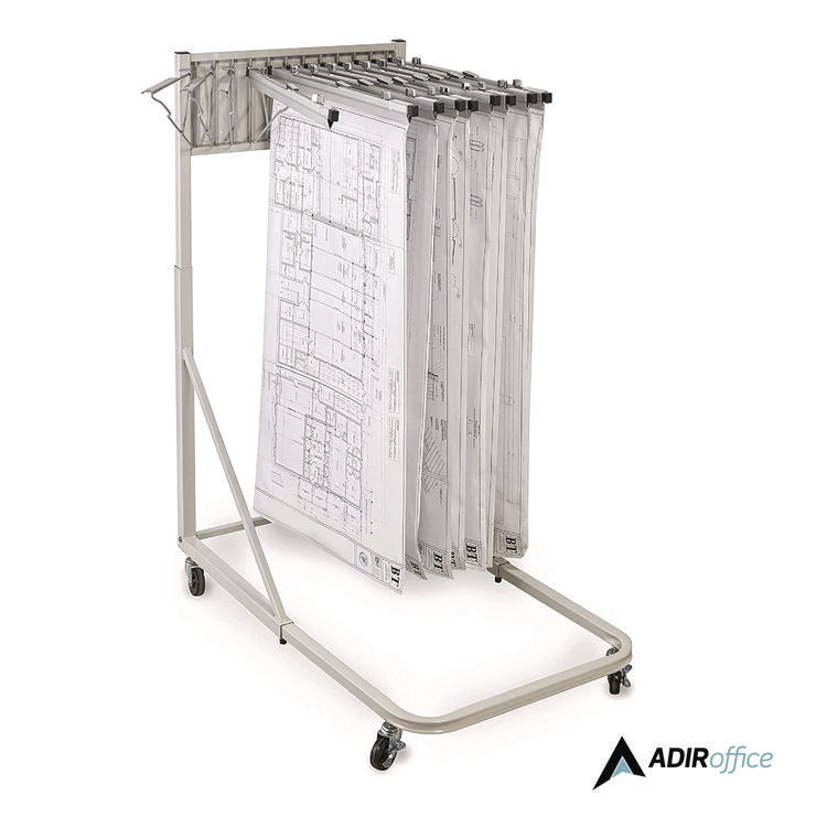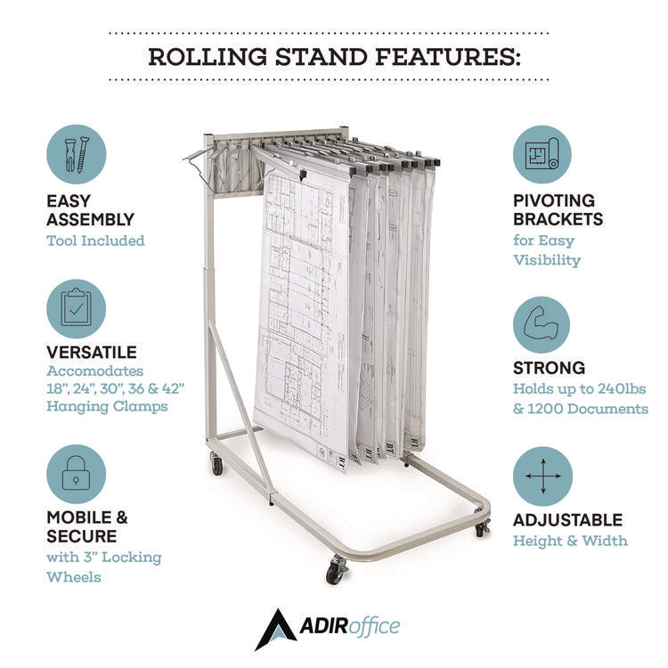 The AdirOffice Vertical File Rolling Stand with 12 Brackets provides hanging blueprint storage that's convenient and easy to get to. The 12 pivot brackets swing out wide so it's a cinch to see and access your blueprints, plan drawings, maps, or other large documents. Just clamp your files into a hanging paper clamp (sold separately) and snap it onto one of the brackets. The brackets accommodate any size clamp, so you can fit documents in a variety of sizes onto this mobile blueprint stand at the same time. This mobile blueprint rack is adjustable to fit even your largest files. Made of solid steel, with a 240 lbs weight capacity (20 lbs per bracket), this hanging file rack can hold a lot of documents. It's easy to move your documents from room to room on this mobile plan rack, which has four 3" swivel wheels. The front two lock to hold it stable when you get it to its destination. Will accommodate all hanging clamps between 18", 24", 30, 36 and 42. (Clamps sold separately.). Color(s): Gray; Rack Style: Blueprint Literature Rack Display; Mounting: Freestanding; Document Size Accommodation: Assorted.