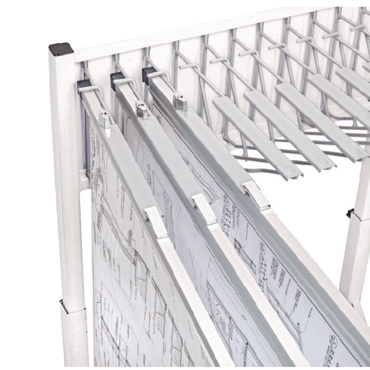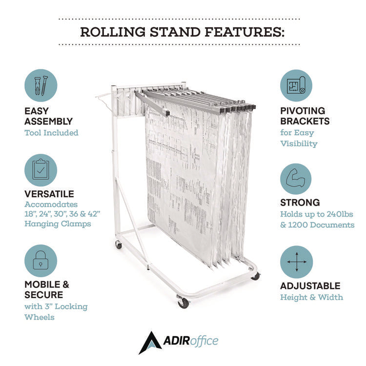 The AdirOffice Vertical File Rolling Stand with 12 Brackets provides hanging blueprint storage that's convenient and easy to get to. The 12 pivot brackets swing out wide so it's a cinch to see and access your blueprints, plan drawings, maps, or other large documents. Just clamp your files into a hanging paper clamp (sold separately) and snap it onto one of the brackets. The brackets accommodate any size clamp, so you can fit documents in a variety of sizes onto this mobile blueprint stand at the same time. This mobile blueprint rack is adjustable to fit even your largest files. Made of solid steel, with a 240 lbs weight capacity (20 lbs per bracket), this hanging file rack can hold a lot of documents. It's easy to move your documents from room to room on this mobile plan rack, which has four 3" swivel wheels. The front two lock to hold it stable when you get it to its destination. Will accommodate all hanging clamps between 18", 24", 30, 36 and 42. (Clamps sold separately.). Color(s): White; Rack Style: Blueprint Literature Rack Display; Mounting: Freestanding; Document Size Accommodation: Assorted.