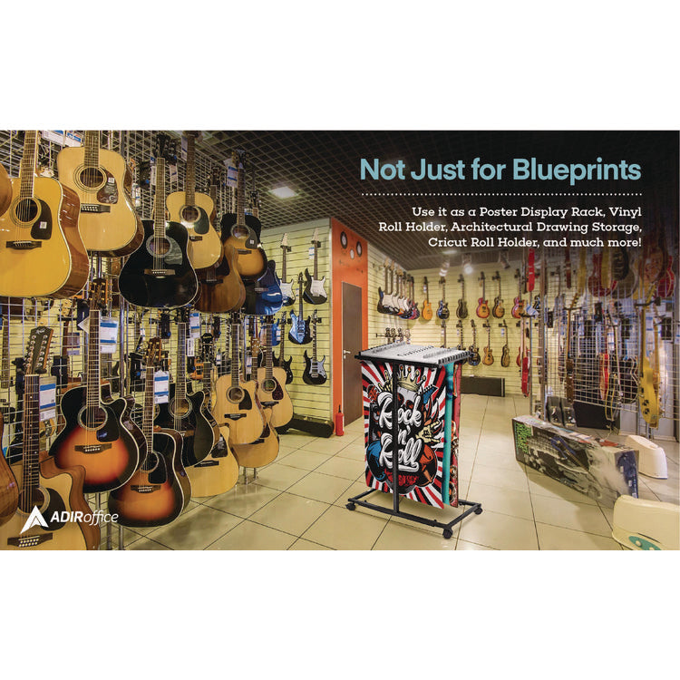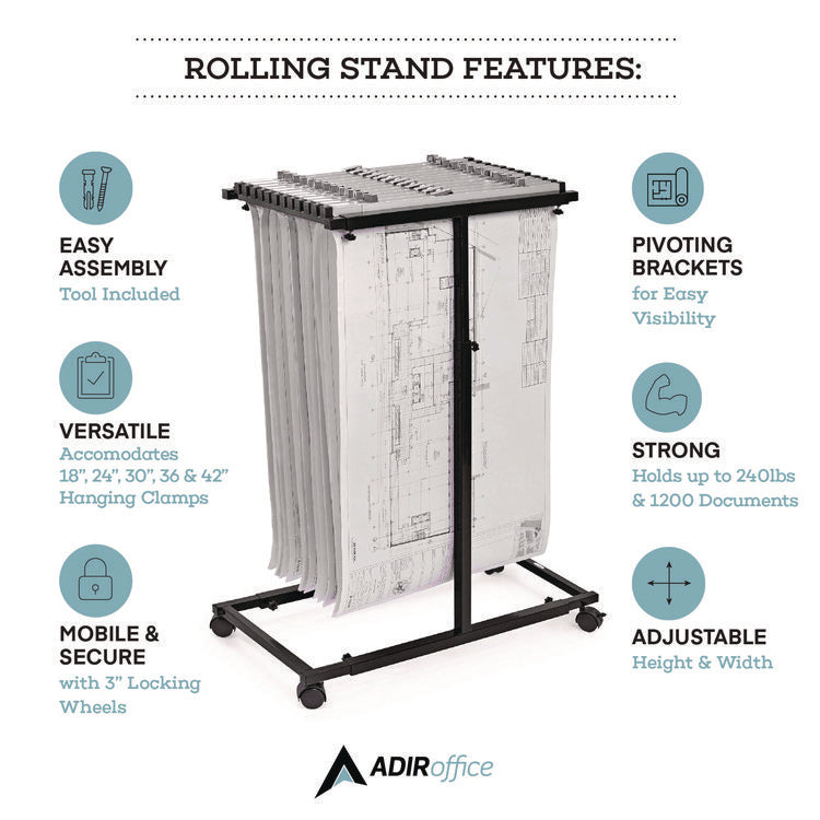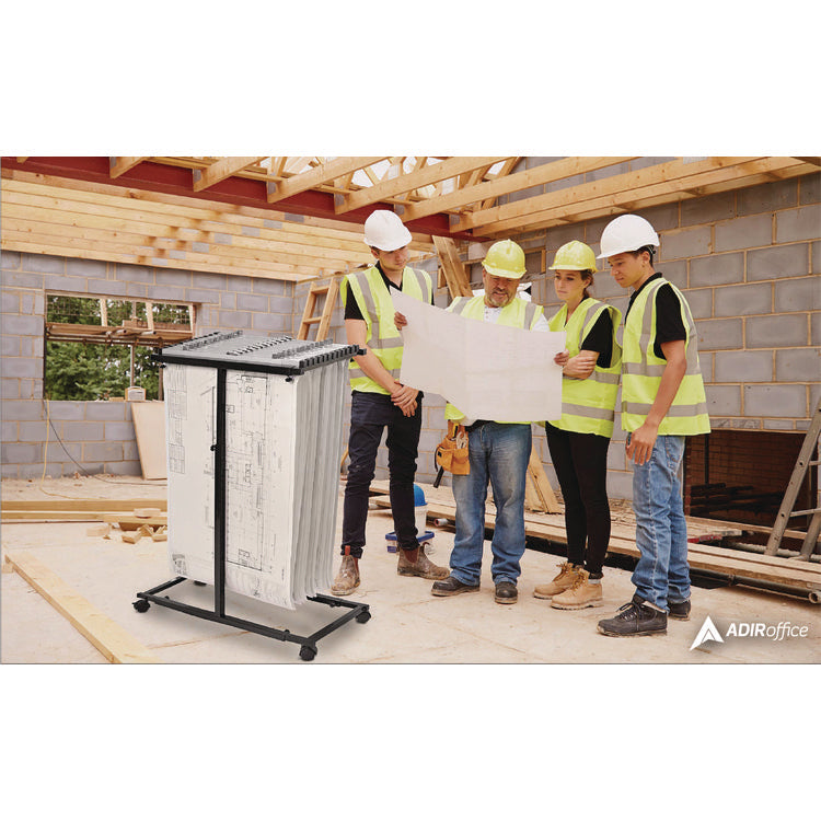 Get organized in the office with the AdirOffice Mobile Vertical Plan Center for Blueprints. For quick access, hanging blueprint storage, just clamp your files into hanging paper clamps and drop them into the top bracket. Designed for blueprints, maps and other large-format documents. Made of solid steel with a 240 lb weight capacity, this rack can hold up to 1,200 documents at once. With its durable construction and powder-coated finish, you can be certain that it will provide long-lasting strength and use throughout the years. For added convenience, this blueprint rack accommodates your largest files. The bracket accommodates 12 clamps and can be adjusted to fit paper clamps that are 36". Only one size of hanging clamps can be placed into this mobile blueprint stand at a time. An ingenious solution to the difficulties of moving documents, this mobile plan center works equally well in harsh environments such as construction sites and soft settings such as modern offices. It glides easily across spaces on its four swivel casters, two of which brake for control of movement and to keep it stable when you get to your destination. Color(s): Black; Rack Style: Blueprint Literature Rack Display; Mounting: Freestanding; Document Size Accommodation: Assorted.
