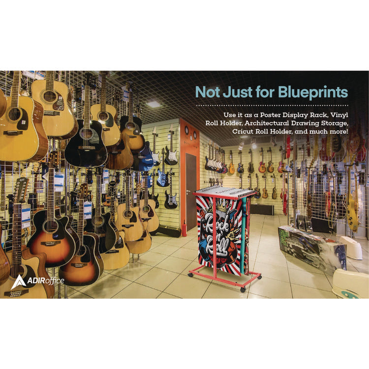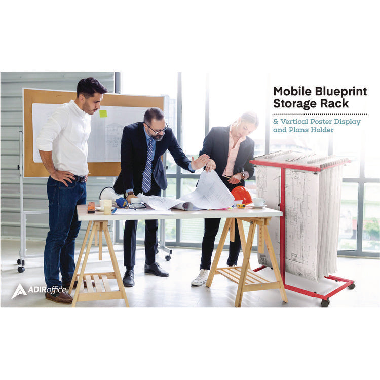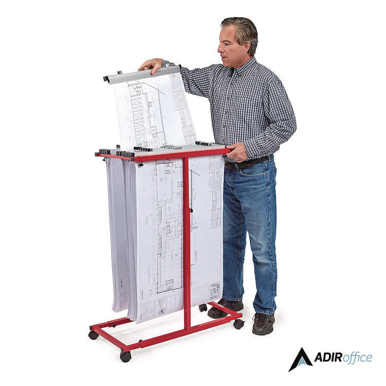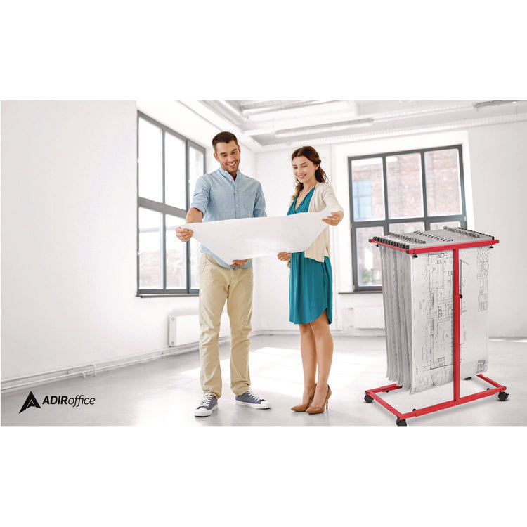 Get organized in the office with the AdirOffice Mobile Vertical Plan Center for Blueprints. For quick access, hanging blueprint storage, just clamp your files into hanging paper clamps and drop them into the top bracket. Designed for blueprints, maps and other large-format documents. Made of solid steel with a 240 lb weight capacity, this rack can hold up to 1,200 documents at once. With its durable construction and powder-coated finish, you can be certain that it will provide long-lasting strength and use throughout the years. For added convenience, this blueprint rack accommodates your largest files. The bracket accommodates 12 clamps and can be adjusted to fit paper clamps that are 36". Only one size of hanging clamps can be placed into this mobile blueprint stand at a time. An ingenious solution to the difficulties of moving documents, this mobile plan center works equally well in harsh environments such as construction sites and soft settings such as modern offices. It glides easily across spaces on its four swivel casters, two of which brake for control of movement and to keep it stable when you get to your destination. Color(s): Red; Rack Style: Blueprint Literature Rack Display; Mounting: Freestanding; Document Size Accommodation: Assorted.