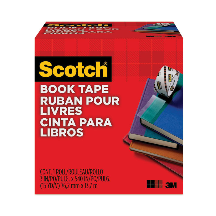 Scotch® Book Tape is excellent for repairing, reinforcing, protecting and covering bound edges and surfaces. Use on books, magazines, pamphlets, record album jackets and more. Single Roll. Core Size: 3"; Dispenser Included: No; Adhesive Material: Acrylic; Tensile Strength: 45 lb/in.