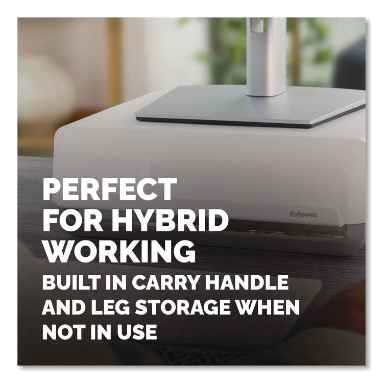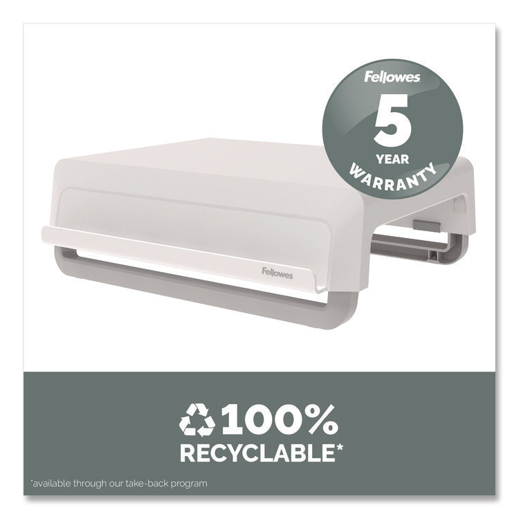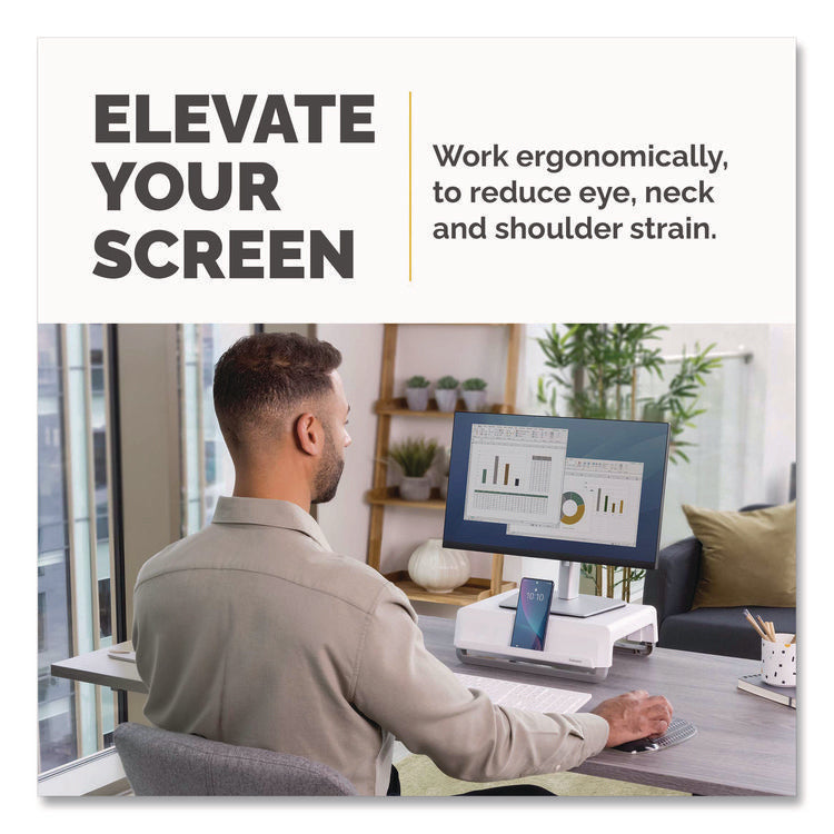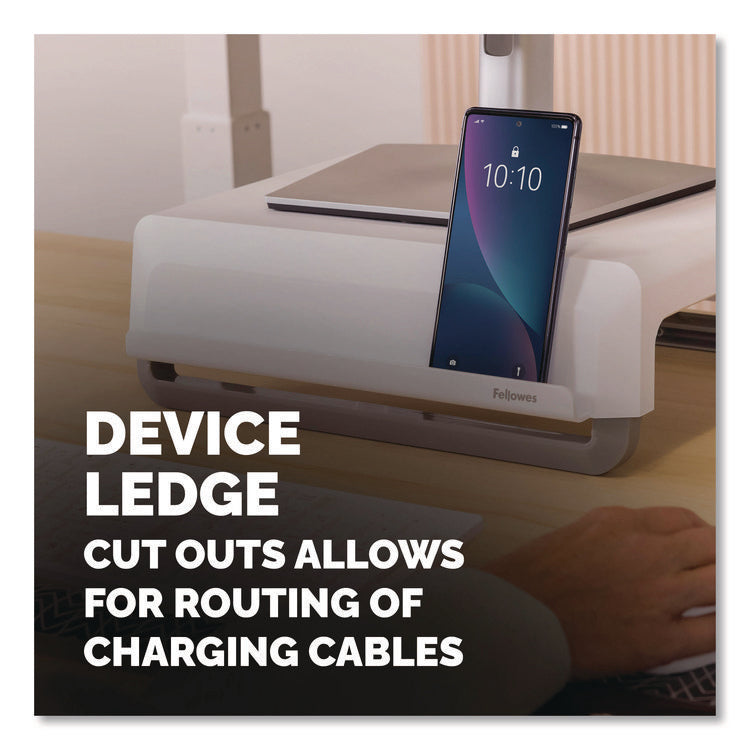 Featuring a modern design aesthetic and an innovative feature set, the Breyta™ Monitor Stand is an excellent choice for anyone who wishes to alleviate eye, neck and shoulder strain by elevating their monitor to a more comfortable level. With three height settings and a unique stacking column design, it's easy to achieve an ergonomic viewing angle; and since the stacking columns can be clipped flat against the underside of the platform, it's compact and portable, too, making it ideal for hybrid work scenarios. The support columns also feature an open-loop design and non-skid rubber feet to both accommodate cord management and deliver extra stability. Sturdy, high-impact plastic construction. Workstation Type: Mobile Workstation; Traditional Desk/Table; Series Name: Fellowes® Breyta; Width (Max): 13.94"; Depth (Max): 11.97".