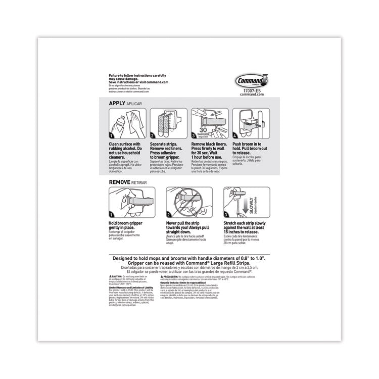 The broom gripper is great for neatly storing your brooms when not in use; simply push broom handle into gripper for easy storage and pull it out when ready to use. Sturdy gripper holds up to 4 pounds and accommodates brooms with 0.8"-1.0" diameter handles. Uses revolutionary adhesive to hold strongly on a variety of surfaces, including paint, wood, tile and more. Damage-free gripper holds strong and removes cleanly, leaving no holes, marks, sticky residue or stains. Rehanging items is as easy as applying a Command™ Refill Strip, so you can take down, move and reuse it again and again! Hang a Command™ Broom Gripper in the mud room, laundry room and closet for easy access. Pack—Includes three grippers and six large adhesive strips. Height: 3.34"; Width: 3.12"; Depth: 1.85"; Color(s): White/Gray.