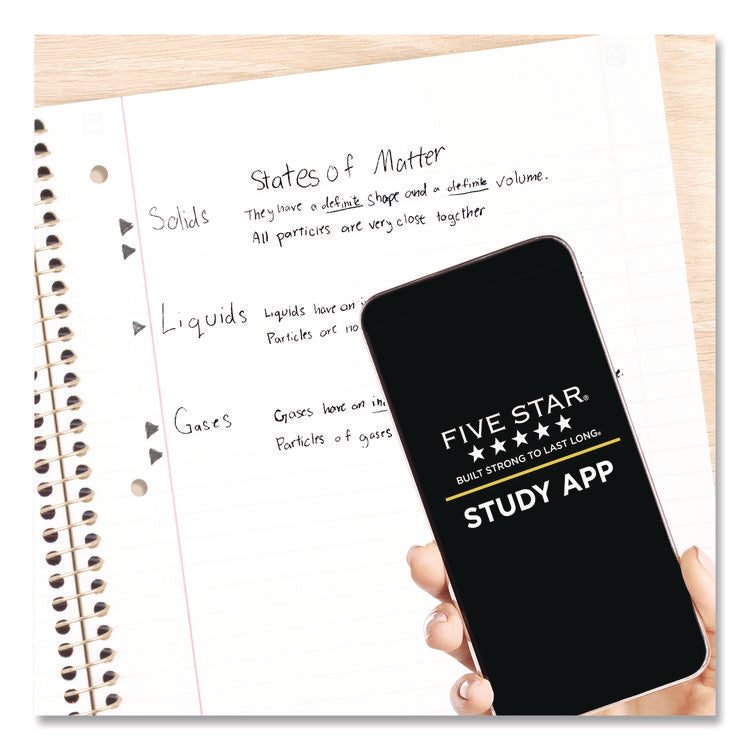 Express yourself in style with the confident and energetic vibe of the Brushy Moves Spiral Notebook's cover designs. Water-resistant poly cover protects your notes all year, and the Five Star® Study App allows you to sync your notes with Google Drive for instant access from any device. Simply flag, scan, edit and organize. Tear-resistant divider pockets keep your loose sheets together, and Spiral Lock® wire binding prevents coil snag. High-quality paper provides excellent ink-bleed resistance. Lasts all year. Guaranteed! Pocket-Sized Indicator: No; Book-Binding Type: Spiral Coil; Book-Binding Details: Spiral Lock®: Flexible Cover; Book-Binding Edge: Side.