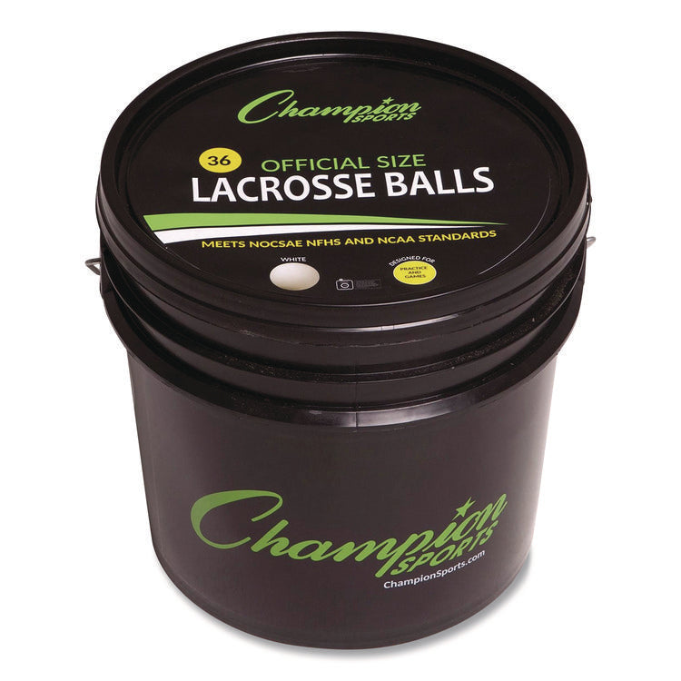 Stock up with a bucket full of regulation size, regulation weight lacrosse balls from Champion Sports. Approved by the NFHS and NCAA for official gameplay at the high school and collegiate levels, these precision molded rubber balls are designed to provide a professional feel and a proper flight profile to help ensure shooting and passing accuracy on the field. Rugged storage bucket with metal wire handle, molded plastic handgrip and lift-off lid keeps the balls neat and tidy until it's time to play. Whether you're trying out for your junior varsity team or a seasoned pro, Champion Sports Lacrosse Balls are an essential. SEI certified balls also conform to all NOCSAE® standards. Diameter: 2.5"; Material(s): Poplypropylene; Regulation Size: Yes; Color(s): White.