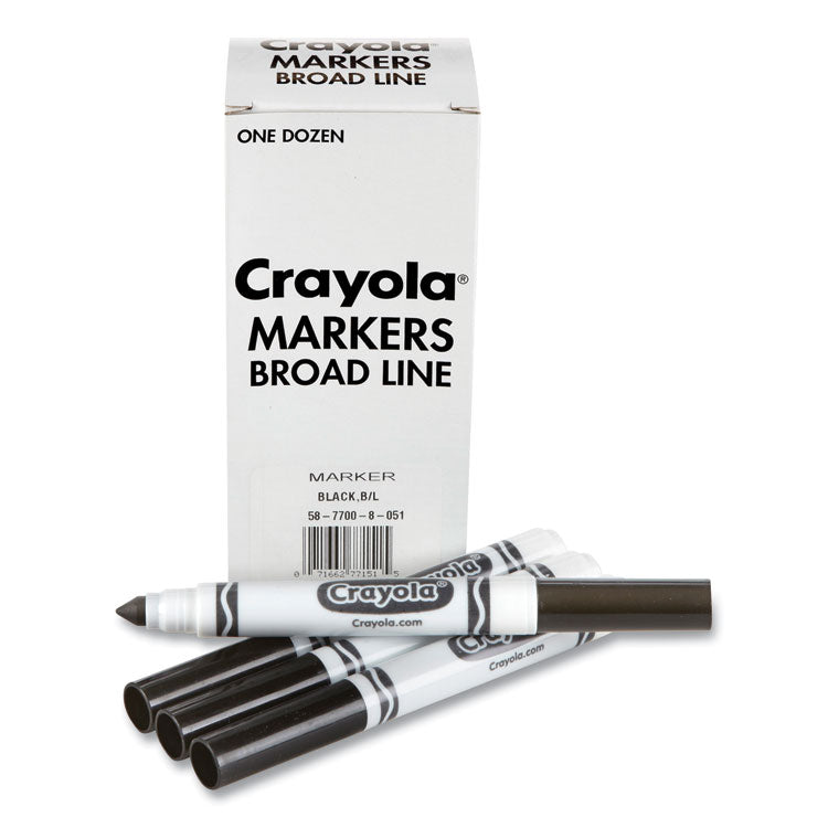 Order your favorite Crayola marker color in bulk! Conveniently packaged in a reusable tuck box, each set contains 12 of the same color. With its conical tip, the Crayola broad-line marker is a versatile drawing tool. Perfect for coloring in large areas, this marker is also great for drawing thin lines or dots. Kids can even create a ribbon effect with lines that taper from thick to thin. The broad-line marker lays down plenty of color and won't smudge or bleed through paper. Great for classrooms, art studios, and more! Marker Ink Type: Permanent; Marker Tip Type: Bullet; Marker Tip Size (text): Broad; Marker Color(s): Black.