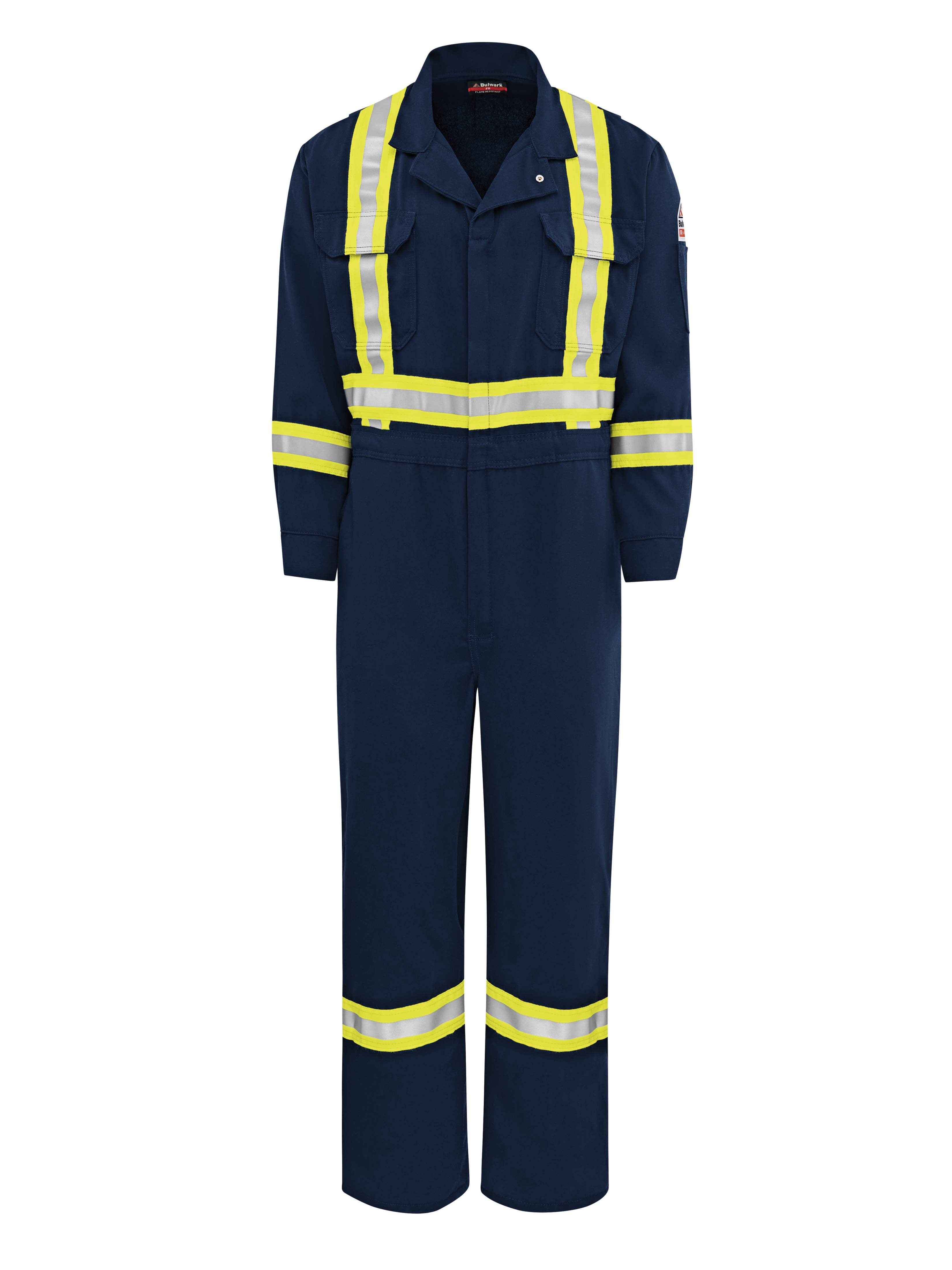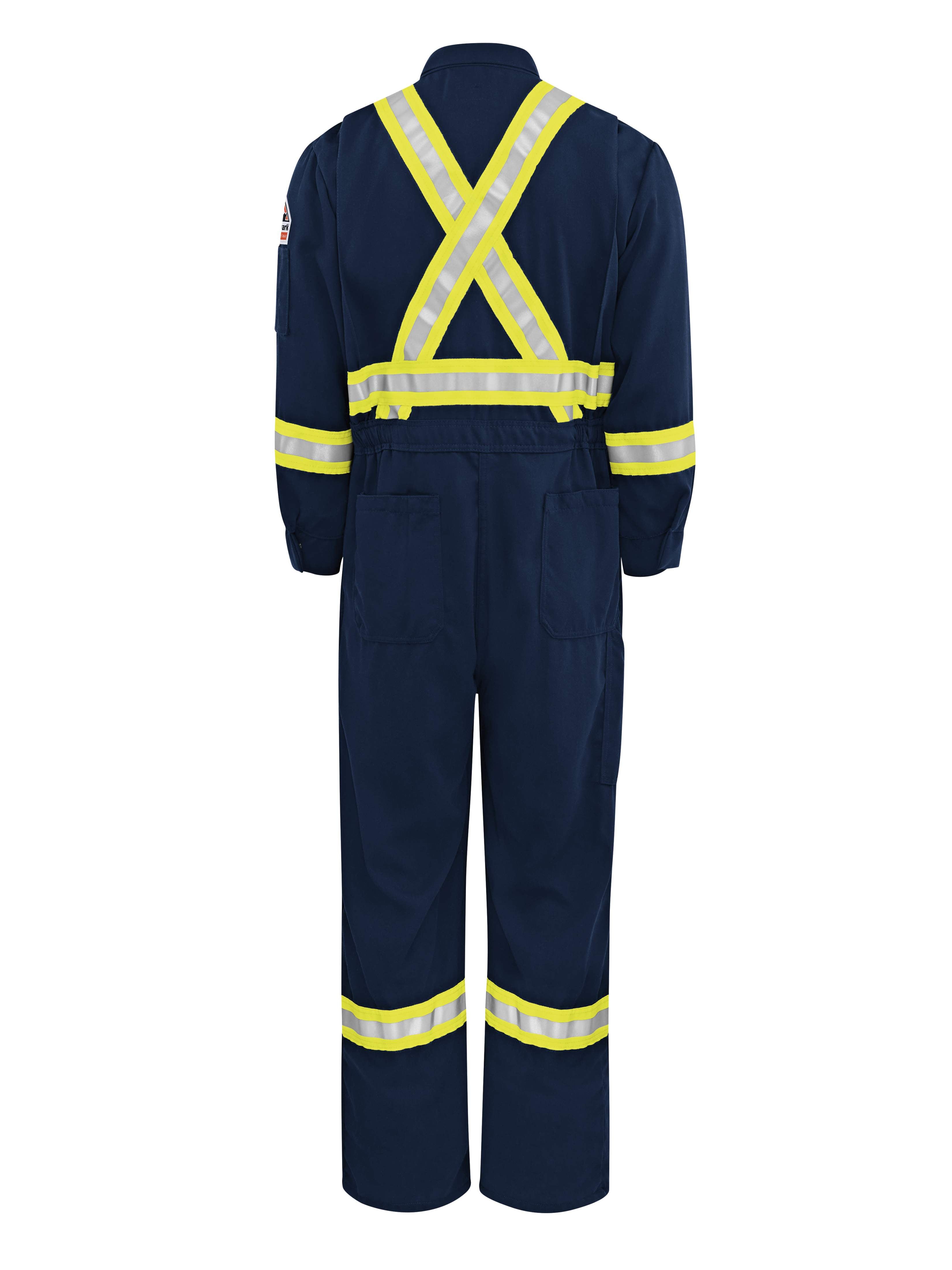 One-piece, topstitched, lay-flat collar. One-piece bi-swing action back. Two-way concealed Nomex® taped brass breakaway zipper, concealed snap at top of zipper at neck. Two, two-needle topstitched patch chest pockets with flaps and concealed snap closures. Two inset lower front pockets are topstitched and lined. Two patch hip pockets have single concealed snap closures. One sleeve pocket sewn to left bicep with pencil stall. One piece rule pocket on right leg. Elastic waist inserts in back. 360 visibility with front and back 2.5” yellow/silver/yellow reflective striping. This garment meets the requirements of NFPA 2112, Standard on Flame-Resistant Garments for Protection of Industrial Personnel Against Flash Fire, 2018 Edition.