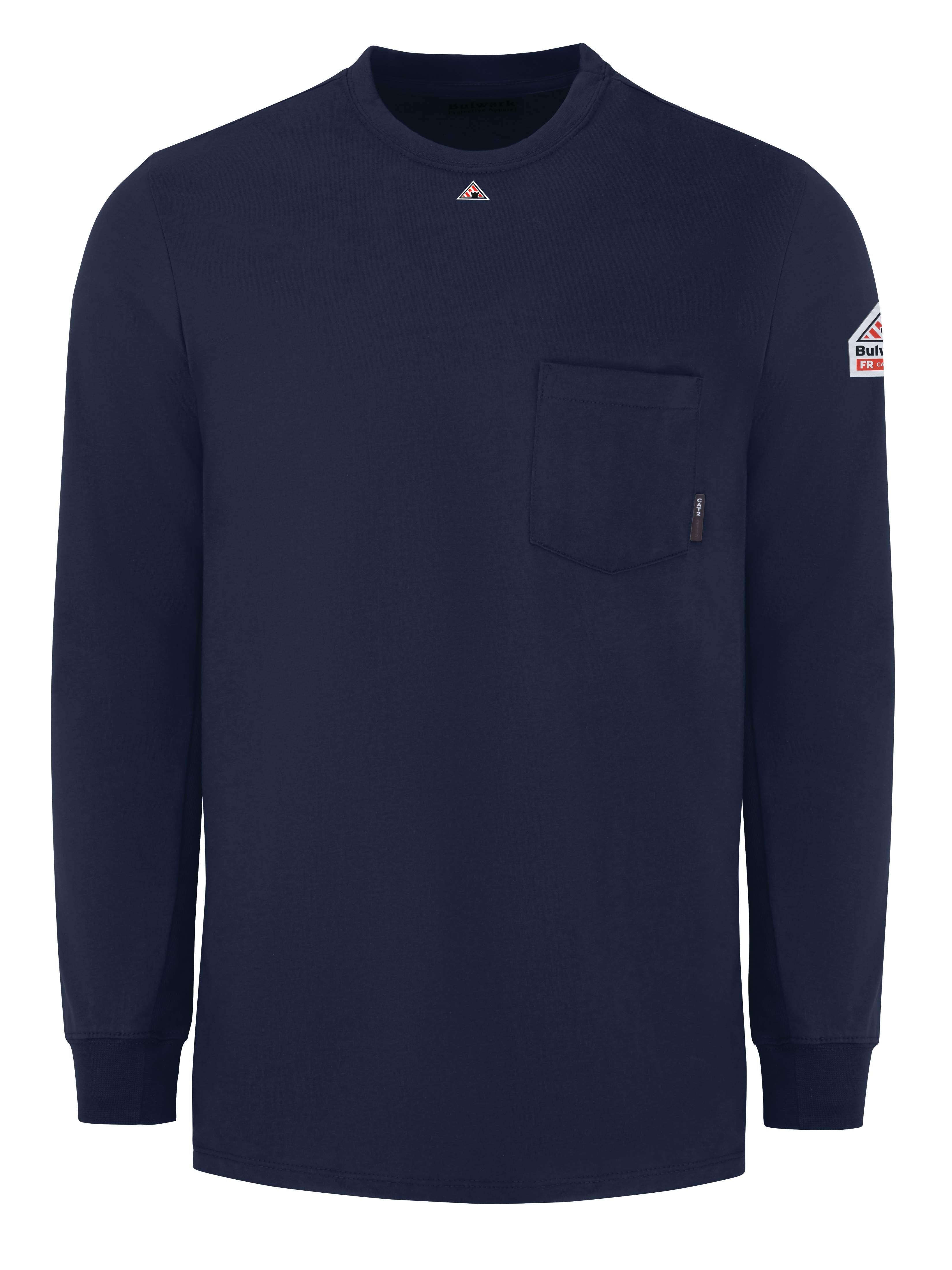 Meet the most comfortable FR long sleeve T-shirt you'll ever wear. This CAT 2 AR/FR, NFPA® 2112 compliant tee features a heat seal Bulwark® triangle centered at neck to show wearer has on FR undergarment.