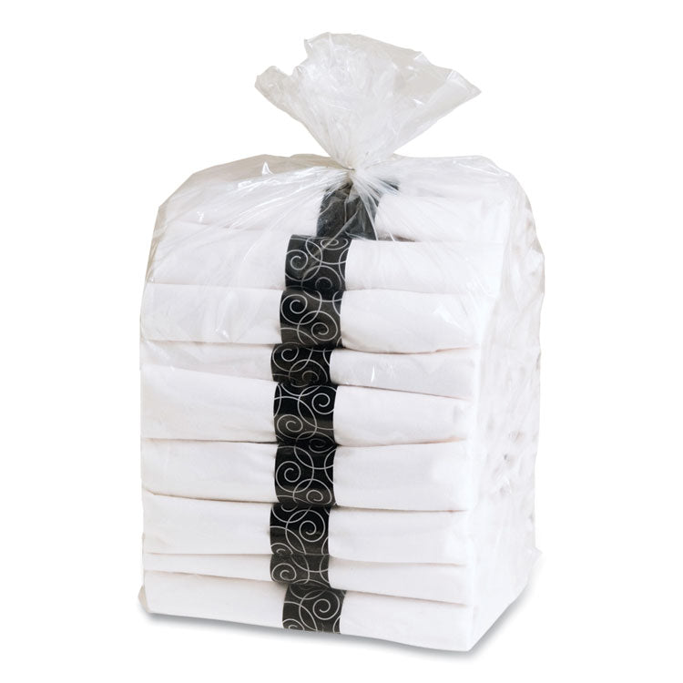 Make an excellent impression with elegantly modern heavyweight utensil sets. Each combo is prewrapped in a thick, dinner-sized Linen-Like® paper napkin. Matching napkin ring keeps everything together. Utensils Type: Fork; Knife; Napkin; Spoon; Material Type: Plastic; Material(s): Plastic (Cutlery); Paper (Napkin); Color(s): Black.