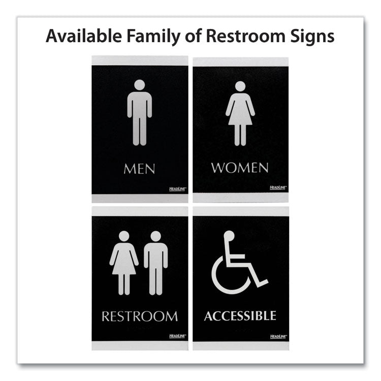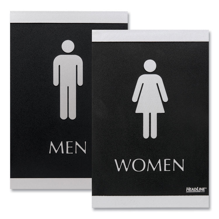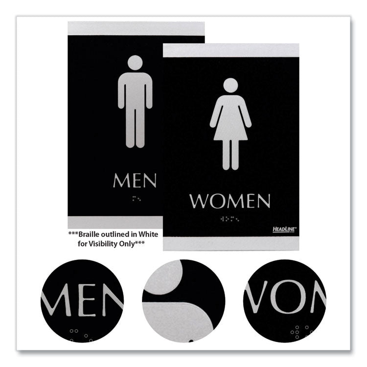 Universally and easily recognizable silver graphics. Raised tactile graphics with Grade 2 Braille. Meets Americans with Disabilities Act (ADA) requirements. Frame Color: Black/Silver; Size: 6 x 9; Message(s): Men; Women; Material(s): Heavy-Duty Plastic.