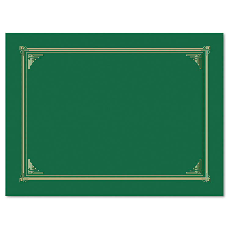 The perfect way to hold and frame precious documents and certificates. Premium 80-lb linen textured cover stock with elegant gold-foil design adds a touch of elegance to any important paper. Easy to use-slip the full-size certificate into die cut to hold 8 x 11 certificates, or A4 and 8 x 10 photos and documents. Also great as photo holders, invitation folders, menus and more. Color(s): Green; Width: 12.5"; Height: 9.75"; Insert Size: 8.5 x 11; 8 x 10; A4.