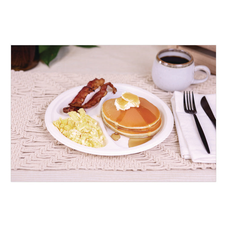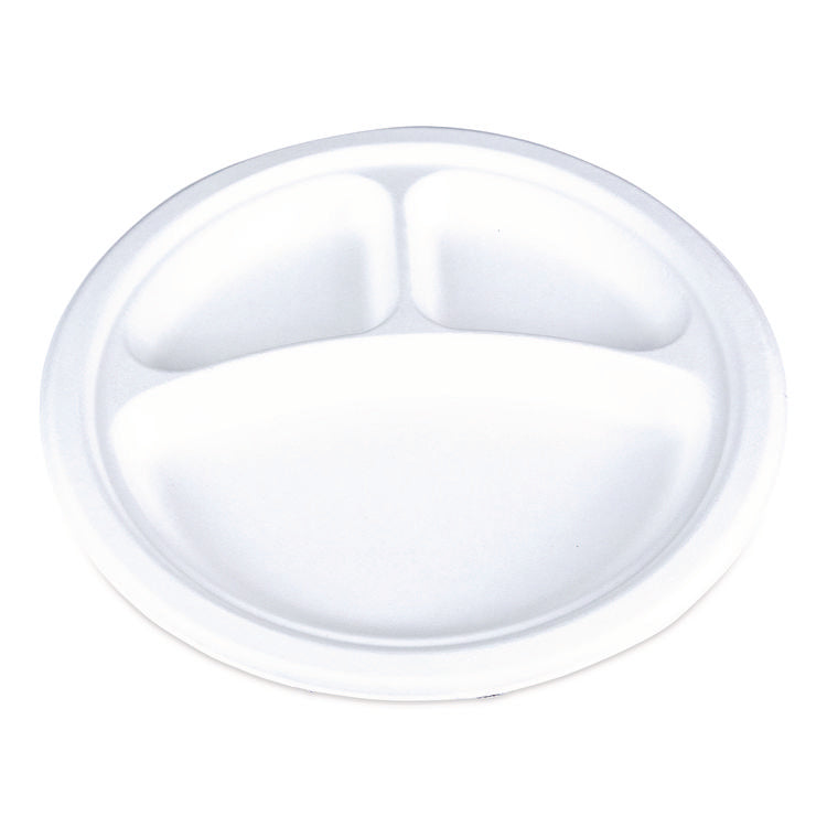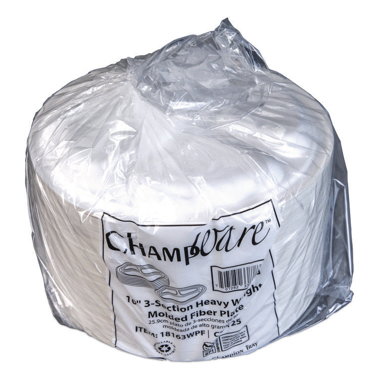 ChampWare Molded Fiber Tableware, 3-Compartment Plate, 10" dia, White, 125/Sleeve, 4 Sleeves/Carton