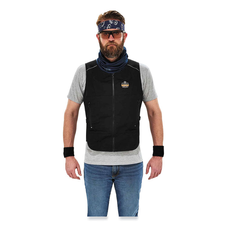 The Chill-Its Lightweight Phase Change Cooling Vest helps to keep workers cooler, safer and more productive. Its phase change cooling material maintains a 64°F/18°C temperature for up to two hours when activated. The vest's adjustable hook and loop closures around the waist provide a customized fit for different body types. The heavy-duty front zipper makes for easy on/off, while the two front zippered pockets can be used to store small accessories. Phase Change Cooling Packs not included. There are many ways to activate your cooling vest. Simply place the four removable packs in a cooler of ice water for five minutes; freezer for eight minutes; refrigerator for 12 minutes; or near an air conditioner for one hour. The cooling pack should be washed by hand with a mild detergent and warm water. Do not machine wash or machine dry. The fabric vest is machine washable with mild soap. Apparel Type: Cooling Vest; Material(s): Cotton; Polyester; Color(s): Black; Color Family: Black.