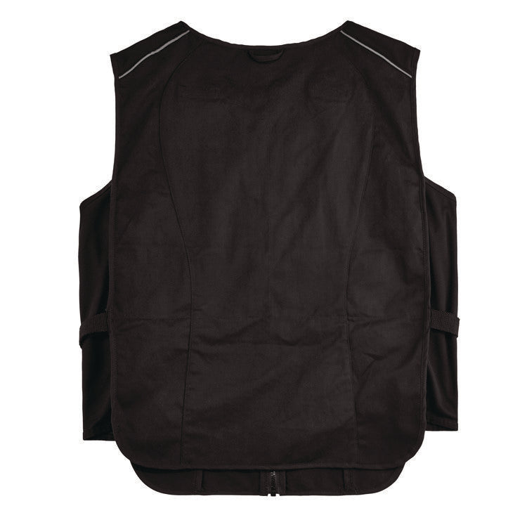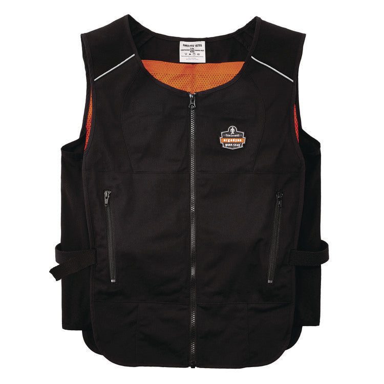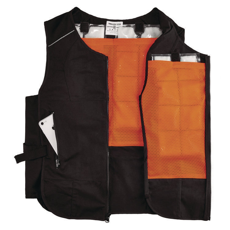 Designed to be thirty to sixty percent lighter weight than other cooling vests on the market, the Chill-Its Lightweight Phase Change Cooling Vest helps to keep workers cooler, safer and more productive. Phase change cooling material maintains a 64°F/18°C temperature for up to two hours when activated. Constructed of a polyester cotton blend fabric, the vest's adjustable hook-and-loop closures around the waist provide a customized fit for different body types. The heavy-duty front zipper makes for easy on/off, while the two front zippered pockets can be used to store small accessories. Simply place the four removable packs in a cooler of ice water for five minutes, freezer for eight minutes, refrigerator for 12 minutes, or near an air conditioner for one hour. The cooling pack should be washed by hand with a mild detergent and warm water. Do not machine wash or machine dry. The fabric vest is hand washable with mild soap. Apparel Type: Cooling Vest; Material(s): Cotton; Polyester; Color(s): Black; Color Family: Black.
