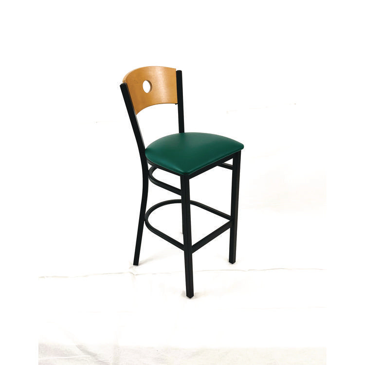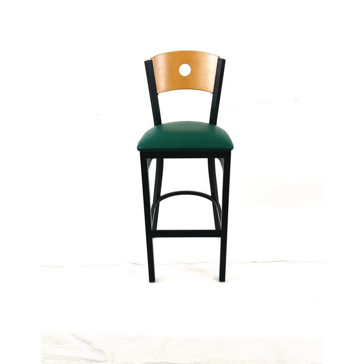 Introducing the perfect seating solution for your home or business-the Circle Series metal framed barstool with vinyl seat pad. This sleek and modern design is built to provide maximum comfort and durability, all while adding a touch of style to your space. With a sturdy metal frame, this barstool is sure to stand up to even the busiest of environments. The frame is built to last, ensuring that you have a reliable seating option for years to come. The vinyl seat pad is not only comfortable, but also easy to clean and provides a soft and supportive surface that is perfect for extended use making it ideal for high-traffic areas. Whether you're using this barstool in your dining room, kitchen, or bar area, it's sure to impress and is the perfect addition to any indoor space. Recommended Application Area(s): Breakroom & Foodservice; Seat Color: Green; Back Color: Natural; Color Family: Green.