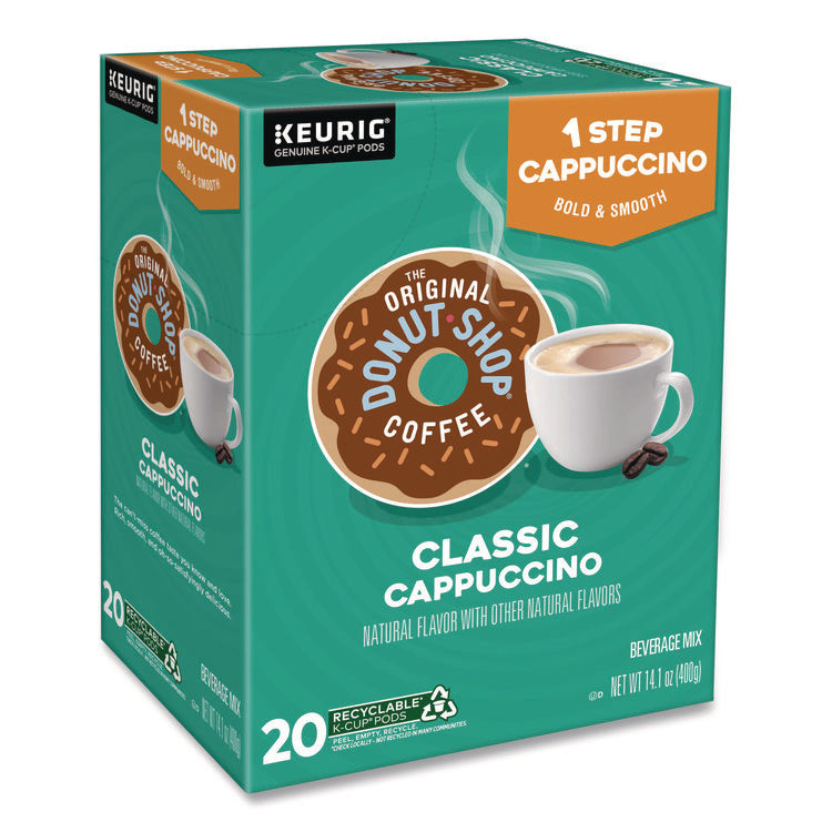 One-Step Cappuccinos, are a line of K-Cup pods from The Original Donut Shop® that allow you to brew delicious cappuccinos at just the push of a button on your Keurig brewer. Nothing beats a perfectly made cappuccino. So rich. So flavorful. So easy! Everything you need to make your perfect cappuccino, all-in-one. It's the bold taste you love, made right when you want it, at the touch of a button. Beverage Mix made with real dairy. No sweetener or creamer needed. Just brew on the 10 oz setting and enjoy! (Choose the 8 oz setting for an even bolder coffee taste.). Beverage Type: Coffee; Flavor: Cappuccino; Roast Type: Light; Product Packaging: K-Cup®.