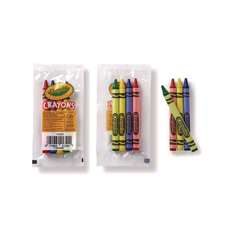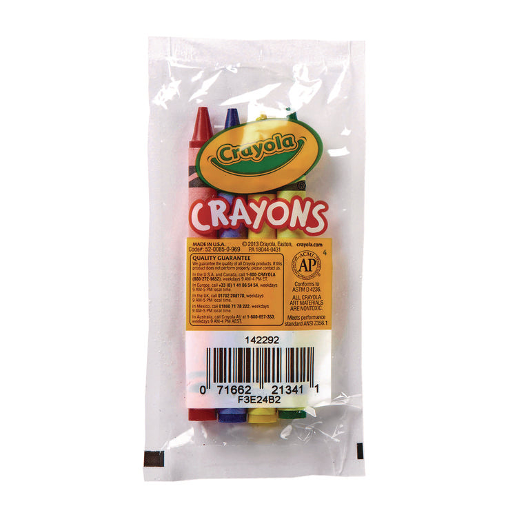 Crayola classic color crayons give artists of all ages an easy way to be creative. Give the young and young at heart a creative outlet with these classic crayons. Each cellophane pouch includes red, blue, yellow, and green Crayola crayons, enough to do justice to almost any coloring book or drawing. Crayons are double wrapped for durability and packed for easy distribution in a playroom, restaurant, party, or other group setting. Color(s): Assorted; Color Family: Multicolor; Color Assortment: Blue; Green; Red; Yellow; Crayon Size: 3.63" x 0.31".