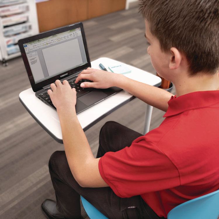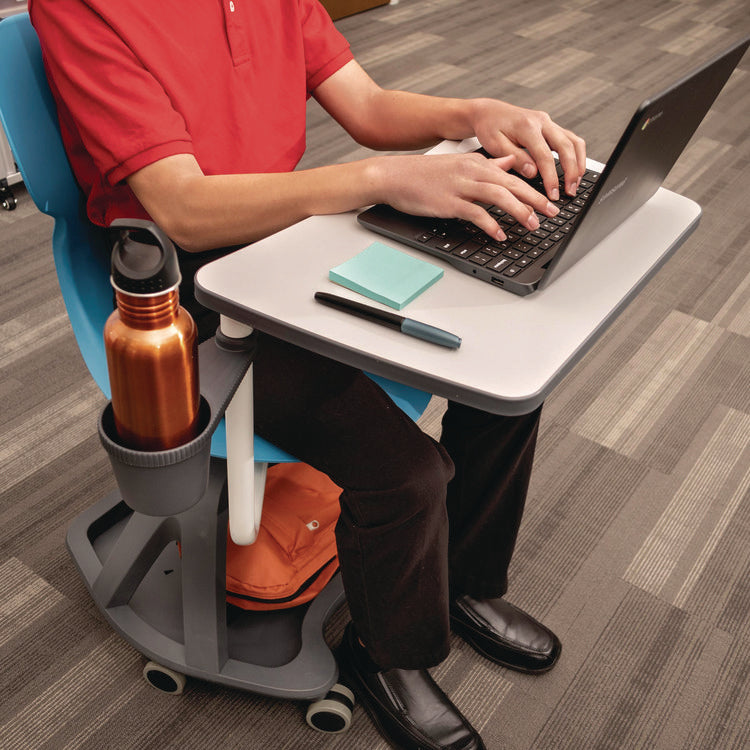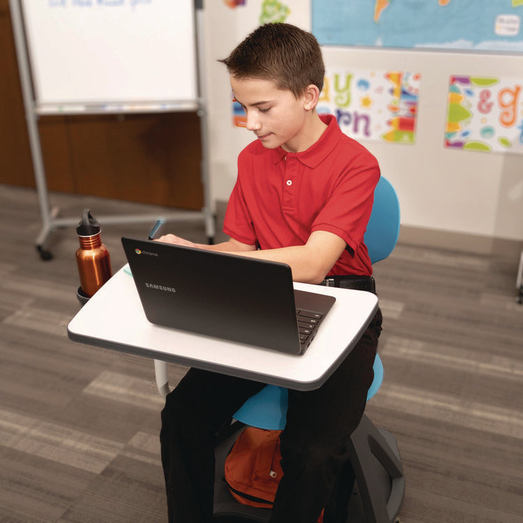 This versatile tablet-arm chair makes it easy to create dynamic seating arrangements in today's fast-paced classroom. Built for grades six and up, it features a space-saving, all-in-one design, so students can have everything they need within easy reach. Highlights include a storage shelf built into the base, a bottle holder and a 360° seat swivel range. A flip-up, swiveling table-arm allows students to get the worksurface out of their way when needed. Students can simply set the tablet-arm to its vertical position and spin it around to place it behind the chair's backrest. Six 2.5" dual-wheel full-swivel casters simplify student-seating reconfigurations. The tough laminated worksurface is easy to clean, while the sturdy polypropylene seat and base are designed to withstand heavy use. Recommended Application Area(s): Classroom & Training; Seat Color: Blue; Back Color: Blue; Color Family: Blue.