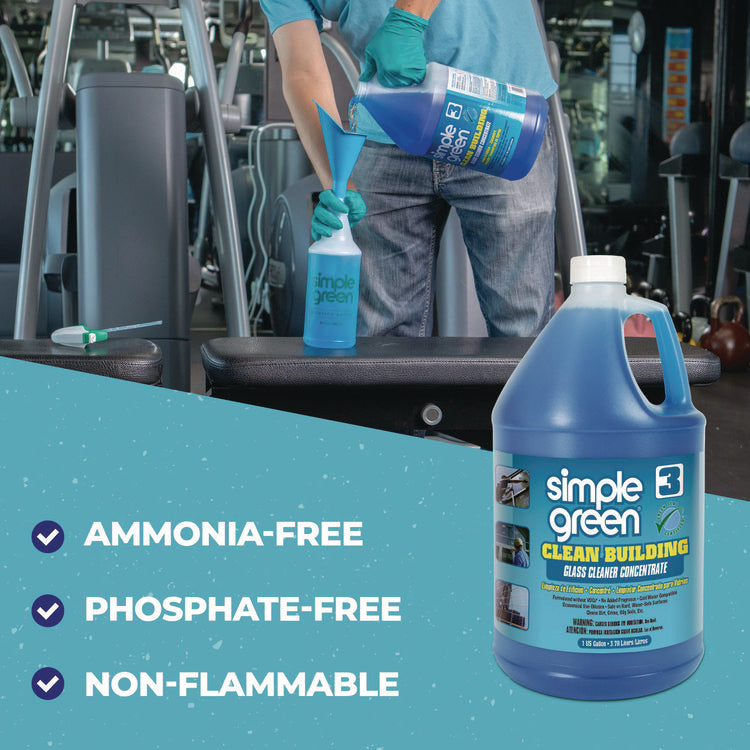 Simple Green Clean Building Glass Cleaner restores clarity and shine to glass, mirrors, and other reflective surfaces. Doesn't leave streaks or smudges behind. The concentrated formula dilutes at 1:30 for great value. Complies with LEED building product purchasing programs. Ideal for industrial and institutional use. Application: Glass Cleaner; Applicable Material: Glass; Mirrors; Plastic; Reflective Surfaces; Dirt Types: Body Oils; Dust; Fingerprints; Grease; Grime; Smudges; Water-Based Soil; Scent: Unscented.