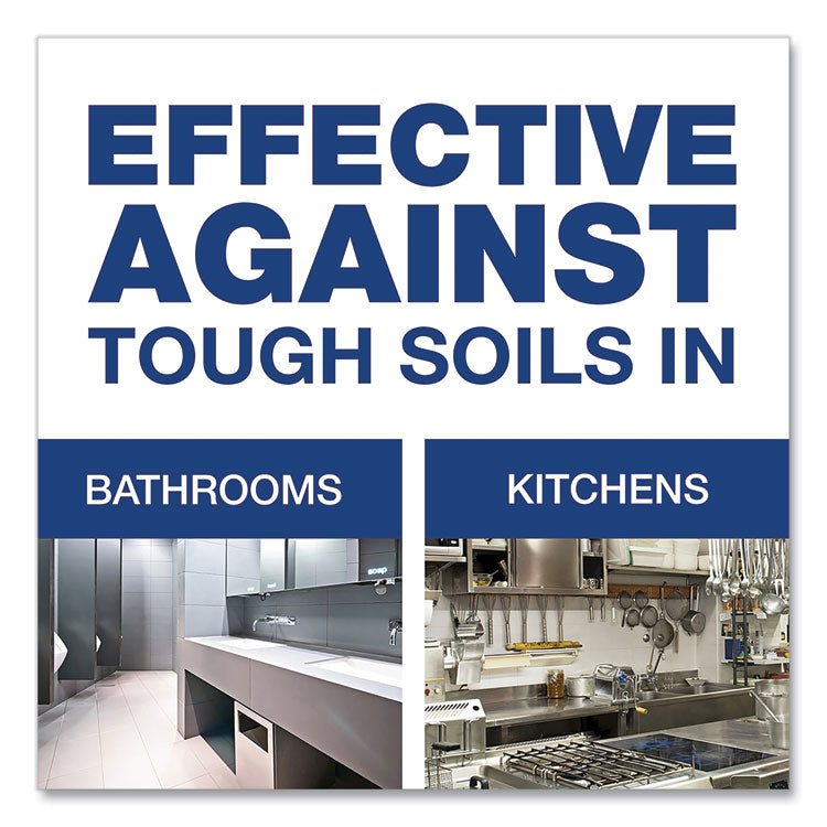 A unique two-in-one all purpose cleaner that combines the cleaning power of heavy-duty detergents with the stain-removal power of bleach. Contains patented cleaning technologies and no abrasives to clean the full range of tough kitchen and restroom soils like tracked-in dirt and scuffmarks. Task areas include customer and employee restroom surfaces, kitchens, the inside and outside of plastic trash containers, and greasy equipment containers. Application: All-Purpose; Applicable Material: Ceramic; Fiberglass; Plastic; Porcelain; Stainless Steel; Tile; Chemical Compound: Bleach; Dirt Types: Grease; Grime; Soap Scum.