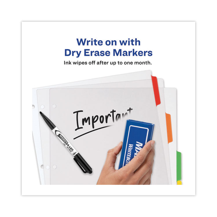 These clear, easy view durable plastic dividers let you easily create or update your section titles with no tab inserts or labels needed. The 3-ring binder dividers and sheet protector work together to provide a clean, professional look and the flexibility to easily make changes or reuse your page dividers again and again. Just print your section titles on a plain sheet of paper and insert the sheet into the included sheet protector. Place the sheet protector in the back of your binder and the clear plastic dividers allow you to see your section titles below. Our free templates on the Avery site let you easily customize the section titles for your divider tabs in minutes. When you need to make a change or reuse your dividers, simply update the template and print a replacement sheet. The tabs are also writeable with a pen, pencil or marker, while Avery Dry Erase Marker ink can erase off the divider and sheet protector after up to one month. The extra durable, tear-resistant plastic wipes clean with most non-abrasive household cleaners. Index Divider Style: Customizable; Index Divider Size: 11 x 8.5; Punched/Unpunched: 3-Hole Punched; For Use With: Ring Binders.