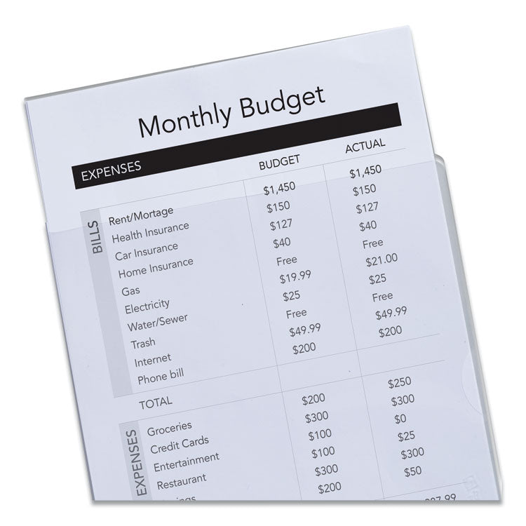 Keep important papers organized and protected against harm with a plastic sleeve. The lightweight, durable plastic is sealed on two sides to keep loose papers securely tucked within the sleeve, while a notch in the front cover lets you quickly grasp papers to remove them. Acid-free, archival-safe material ensures your documents are safely guarded, and the nonstick cover won't cling to inserts and lift print away. The transparent plastic lets you identify the contents of each sleeve with a glance, so you can always be sure you've got the right paperwork for the project. Number of Sections: 1; Tab Cut: Untabbed; Size: Letter; Punched/Unpunched: Unpunched.
