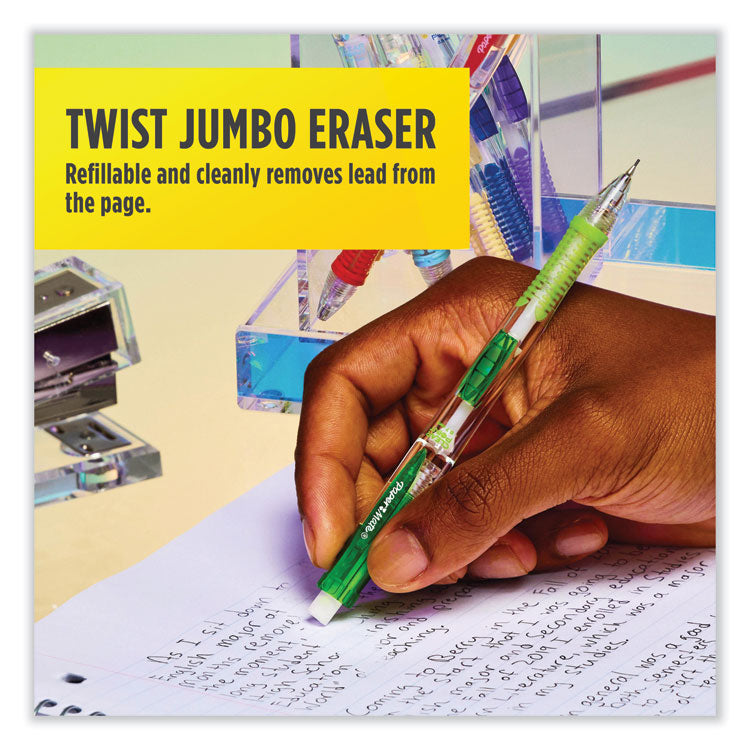The Paper Mate Clearpoint Mechanical Pencil is a precise, fully-featured writing instrument that is ideal for standardized tests, drafting, and homework. These pencils feature a convenient side-click advance mechanism on the barrel that advances the lead with just a click. The textured over-molded grip provides comfort and control during long writing sessions, while the jumbo twist-up eraser lets you easily correct mistakes without any smudges or tearing. Retractable: Yes; Eraser (Yes/No): Yes; Graphite Color(s): Black; Color Family: Black.
