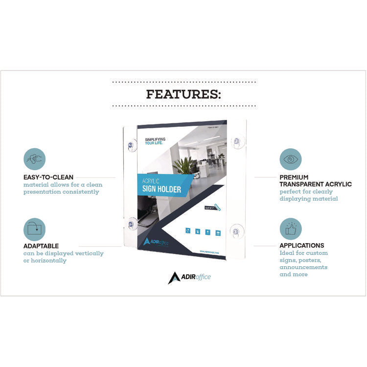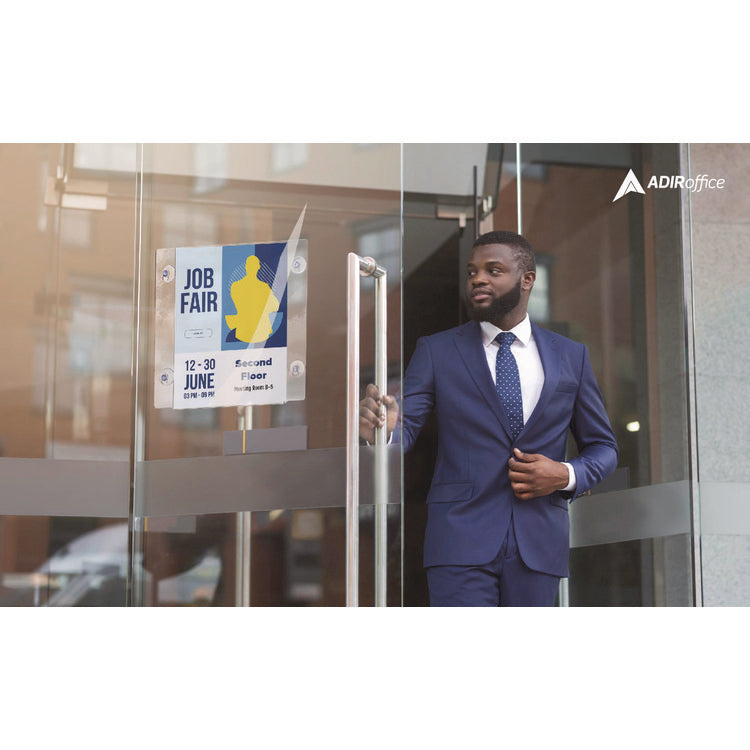 Posting temporary notices for employees, customers, special events, sales, opening/closing hours no longer needs reliance on cellophane tape, masking tape or similar stickums that leave messy residue on glass walls, doors and windows when the event is over. This sign holder is the best alternative to taped notices and subsequent challenges of removing tape residue from glass surfaces. Separate notices on large stock easily slip into the clear acrylic AdirOffice sign holder to reach incoming and outgoing patrons and personnel with relevant messages. Though firmly attached to glass surfaces with its four suction cups, the sign holder is easily lifted up and off to clean glass behind the sign support. Frame Color: Clear; Size: 8 x 11; Message(s): Customizable; Insert Size: 8 x 11.
