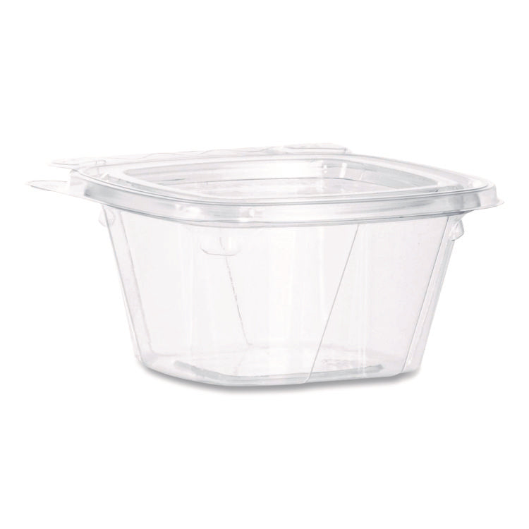 No matter what's inside, these containers keep your food safe, secure and looking good! Designed to prevent tampering without shrink bands or extra wrapping, our containers make sharing food easy. Keep contents fresh and prevent leaks with the secure perimeter seal. The tamper alert hinge has a visible seal that, if broken, makes it obvious the container has been opened. The specialty lid inhibits the ability to lift it from the base without tearing the hinge. Once the seal is broken, the now two-piece container is easy to re-close and continues to be leak-resistant. Make sure your food is the star of the show thanks to the crystal-clear material. Merchandising and delivery is a breeze the sturdy stackable design. They're even great for at-home use. Transport salads, fruits, or desserts to your next picnic, potluck, or bake sale. Food Container Type: Hinged Lid Container; Material(s): PET - Polyethylene Terephthalate; Material Type: Plastic; Interior Volume Capacity: 6 oz.