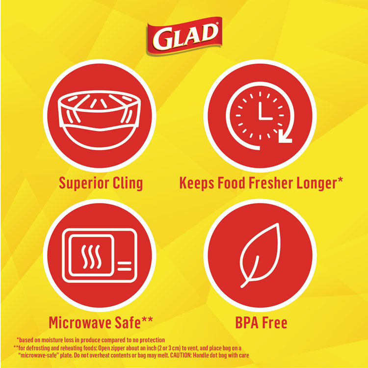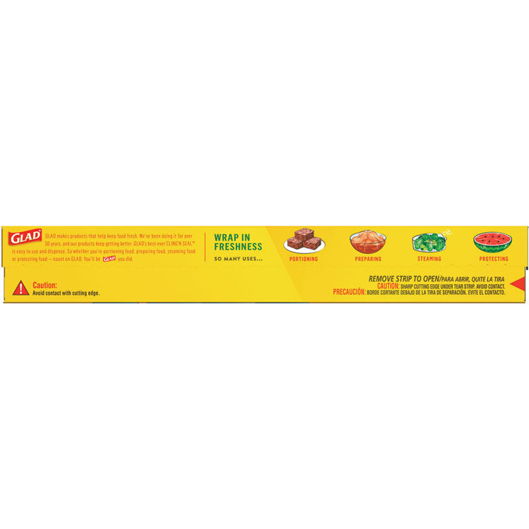 Glad ClingWrap extends your food's freshness by keeping air out with a superior seal cling versus the national brand. With 3X the freshness based on moisture loss in produce versus no protection, keep your foods fresher longer. Its easy-to-use roll makes protecting your favorite foods fast and simple. This food wrap is easy to handle and grips to a variety of surfaces, such as glass and metal, making it useful for portioning, preparing, steaming and protecting. ClingWrap can be used outside of the kitchen too. It is great to use for preventing leaks in toiletries when traveling, wrapping wet paint brushes to use later, or keeping items in drawers when moving. Glad ClingWrap contains no plasticizer, and is BPA free and microwave safe. Ideal for use in restaurants, cafeterias and other food service facilities. Glad protects and seals with ease. 100 sq ft. Material(s): Plastic; Length: 33.3 yd; Width: 12"; Product Packaging: Box.