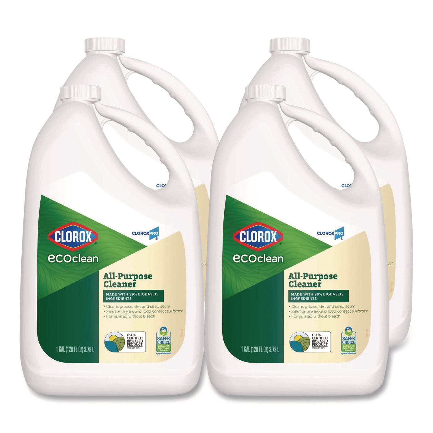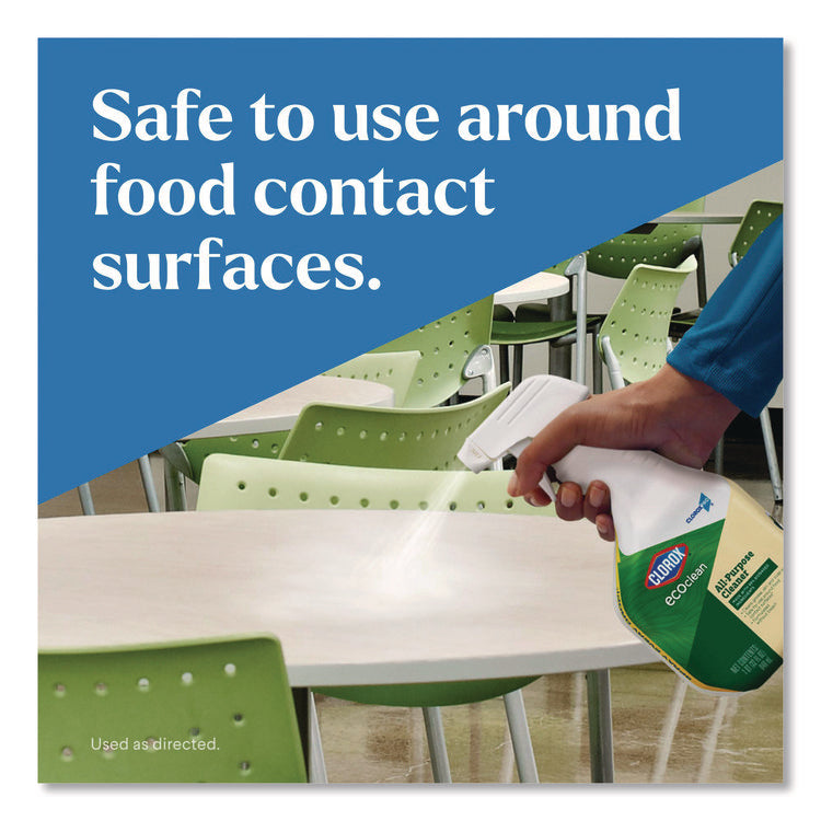 Clorox EcoClean All-Purpose Cleaner cleans grease, grime, dirt, soils and messes, and is safe for use on multiple surfaces throughout the kitchen and bathroom, including counters, appliances, stainless steel, sealed granite, chrome, cooktop hoods, sinks and toilets. This all-purpose cleaning spray meets US EPA Safer Choice Product standards and is a USDA Certified Biobased cleaner, made with 99% plant-based cleaning ingredients. This all-purpose spray is formulated without parabens, dyes, phthalates, phosphates, petroleum solvents and SLES. Great for commercial use in schools, offices, hospitals, veterinary clinics, athletic facilities, airports and more, Clorox EcoClean All-Purpose Cleaner effectively cleans without harsh chemical odors, fumes or residues and is safe for use around food contact surfaces with no rinse required. With SmartTube technology, you can spray every drop and get the most out of the bottle. Application: General Purpose; Applicable Material: Chrome; Sealed Granite; Stainless Steel; Chemical Compound: Water; Caprylyl/Capryl Glucoside; Lauryl Glucoside; Ethanol; Sodium Gluconate; Potassium Citrate; Potassium Carbonate; Sodium Hydroxide; Citric Acid; Methylisothiazolinone; Dirt Types: Dust; Grease; Grime; Oil; Soil.