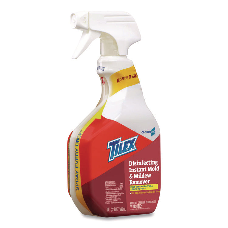 CloroxPro Tilex Disinfecting Instant Mold and Mildew Remover kills 99.9% of viruses (Staphylococcus aureus, Salmonella enterica, Trichophyton interdigitale (Athlete's Foot Fungus), Influenza A) and bacteria, including SARS-CoV-2 the virus that causes COVID-19 on hard, non-porous surfaces when used as directed. This disinfecting spray kills mold, mildew, and bacteria as it cleans, removing mildew stains without scrubbing. The unique formula whitens tile and grout and dissolves soap scum as you spray. It removes and destroys mold spores and cleans tiles, grout, toilets and fiberglass. CloroxPro mildew remover is ideal for offices, day care centers, schools, hotels, restaurants and other commercial facilities. Spray every drop with Smart Tube technology that reaches to the very bottom of the bottle. CloroxPro, where clean means everything. Packaging may vary. Application: Tub/Tile/Shower/Grout Cleaner; Applicable Material: Ceramic; Cement; Fiberglass; Glass; Grout; Laminates; Metal; Plastic; Vinyl; Dirt Types: Bacteria; Dust; Fungus; Germs; Grime; Mildew; Mold; Soap Scum; Soil; Scent: Unscented.