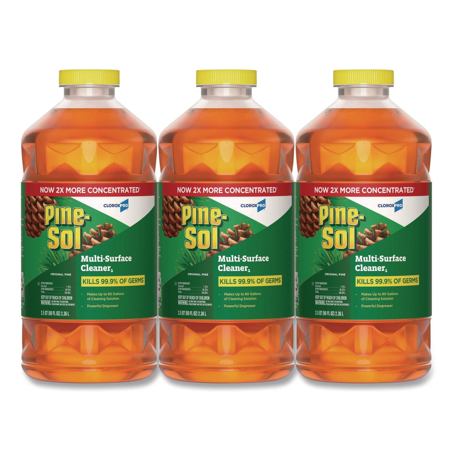 With Pine-Sol® Multi-Surface Cleaner Disinfectant Concentrated from CloroxPro, you only need one product to fight tough dirt, grease and grime. A 2X concentrated formula delivers more cleaning power per drop than previous Pine-Sol® Pine formula. Easier to handle and easier to store, the space-saving bottle gives you more cleaning solution in a smaller bottle made of 30% less plastic. This multipurpose cleaner cleans, deodorizes and disinfects in one step, killing 99.9% of germs and leaving a classic scent. It cuts through grime and soap scum and is safe for use on wood, tile, stone, glass and more when used as directed on hard nonporous surfaces. Do not use on marble, aluminum, copper or wood that is unfinished, unsealed, unpainted, waxed, oiled or worn. Application: Cleaner/Disinfectant; Applicable Material: Baked Enamel; Bamboo; Cement; Chrome; Concrete; [Engineered] Wood; Glazed Ceramic Tiles; Glazed Porcelain; [Hard] Plastic; Hard Vinyl; Laminate; Linoleum; Metal, Sealed Fiberglass; Sealed Granite; Stainless Steel; Vinyl; Chemical Compound: Active Ingredient: Citric Acid; Dirt Types: Dirt; Grease; Grime.