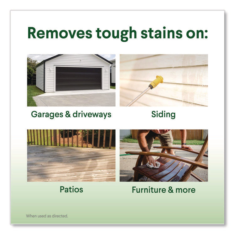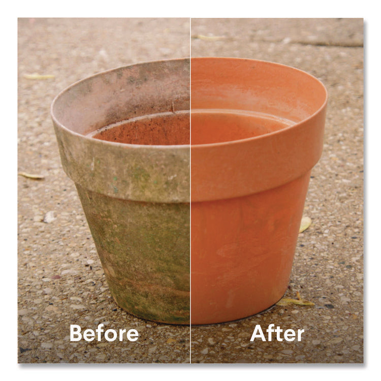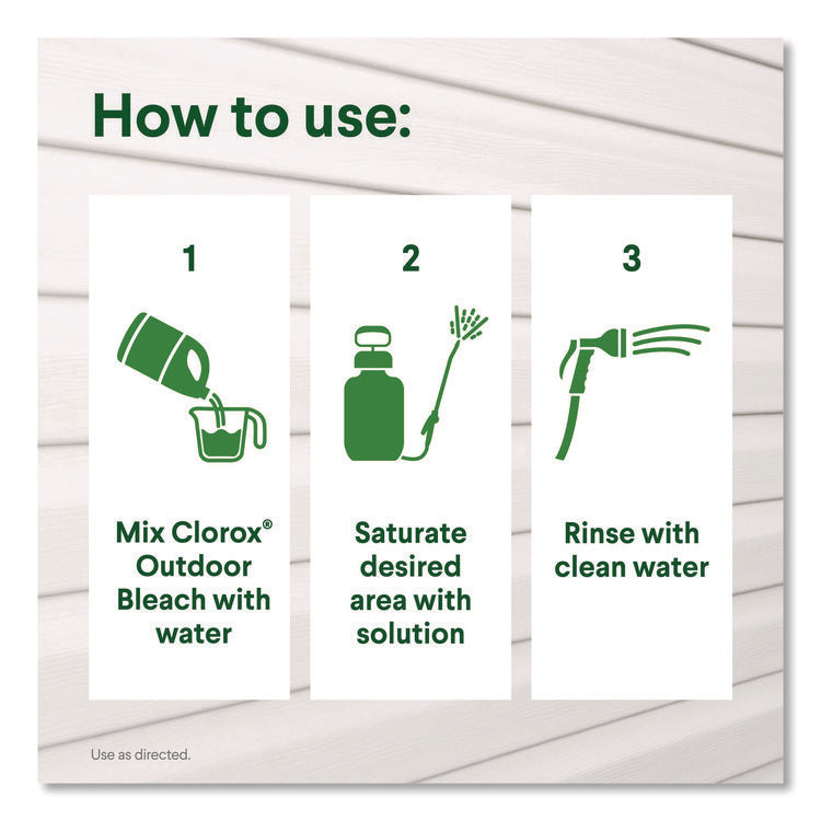 Slimmed down version makes it easier to pour. Clorox Concentrated Outdoor Bleach makes it easy to tackle outdoor stains, dirt and grime on patio furniture, decks, fences, driveways, house siding and more with this outdoor bleach cleaner. It is more concentrated which makes it easier to handle, easier to pour and more cleaning power per drop compared to the previous Clorox Outdoor Bleach. This concentrated version has 33% more compact dose, reducing the amount of bleach required for cleaning. Bring the trusted power of bleach outside and make cleaning and removing outdoor stains a breeze. Great for use in a pump sprayer, no mixing or measuring required. The thicker formula reduces splashing and spilling, so that you can tackle any outdoor mess with less mess. Give your home some curb appeal with the power of Clorox. A little goes a long way with Clorox Outdoor Bleach. Use as directed. Application: Bleach; Applicable Material: Cement; Glass; Metal; Plastic; Chemical Compound: Sodium Hypochlorite; Sodium Hydroxide; Dirt Types: Bacteria; Fungus; Germs; Grease; Mildew; Organic Matter; Soil; Stains.