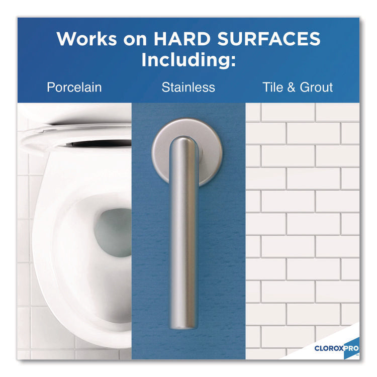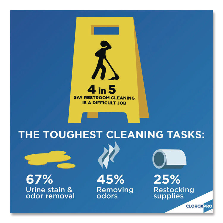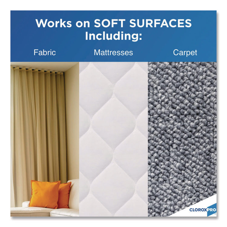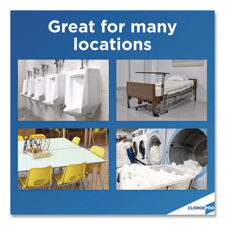 Clorox Urine Remover for Stains and Odors from CloroxPro tackles the toughest urine stains and odors. With the cleaning power of hydrogen peroxide, it quickly breaks down urine to eliminate odors and remove stains. This versatile cleaner is safe to use on most hard and soft surfaces. It is specially formulated for tough-to-clean porous surfaces, like grout, notorious for trapping urine odors. It also handles stains and odors on soft, absorbent surfaces like carpet and mattresses. This urine remover is also great for outdoor concrete, walls and flooring, laundry pre-treatment, pet stains, and bodily fluids removal including feces, blood and vomit. Ideal for offices, day care centers, schools, hotels, restaurants and other commercial facilities. Value Pack—Stock up and save! Application: Disinfectant/Cleaner; Applicable Material: Carpet; Ceramics; Cement; Fabric; Fiberglass; Glass; Grout; Laminates; Metal; Plaster; Plastic; Vinyl; Chemical Compound: Hydrogen Peroxide; Dirt Types: Bacteria; Body Fluids; Germs; Organic Matter; Pet Stains; Water-Based Soil.