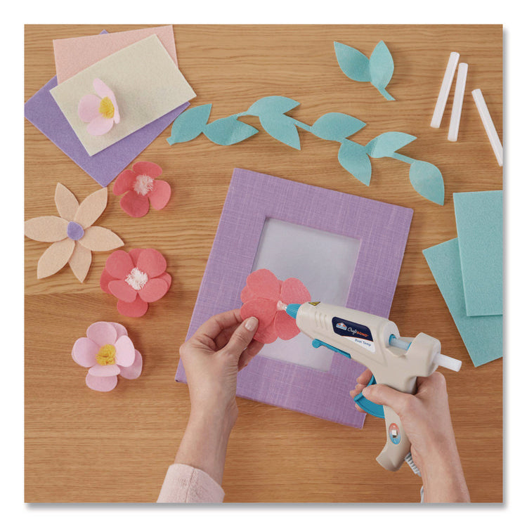 Elmer's CraftBond dual-temperature glue gun is a quality tool that provides you with a safer way to use hot glue. Added safety features include: insulated nozzle for safeguarding against burns, a safety fuse that shuts the hot glue gun off in an event of a short, and built-in side lifts that allow the glue gun to rest safely on its side, preventing glue backup. This dual-temperature glue gun is for great virtually every project: use the high-temperature setting to bond materials such as wood, plastic, and metals, and the low-temperature setting for more delicate materials such as silk flowers and foam. The ergonomic design ensures comfort while hot gluing, and the durable flip-down stand provides stability while not in use. For use with Elmer's CraftBond all-temperature glue sticks. Type of Glue Used: All Temp Hot Glue Sticks; For Use With: Elmer's CraftBond All-temperature Glue Sticks; Heating Element Output Rating: 40 W.