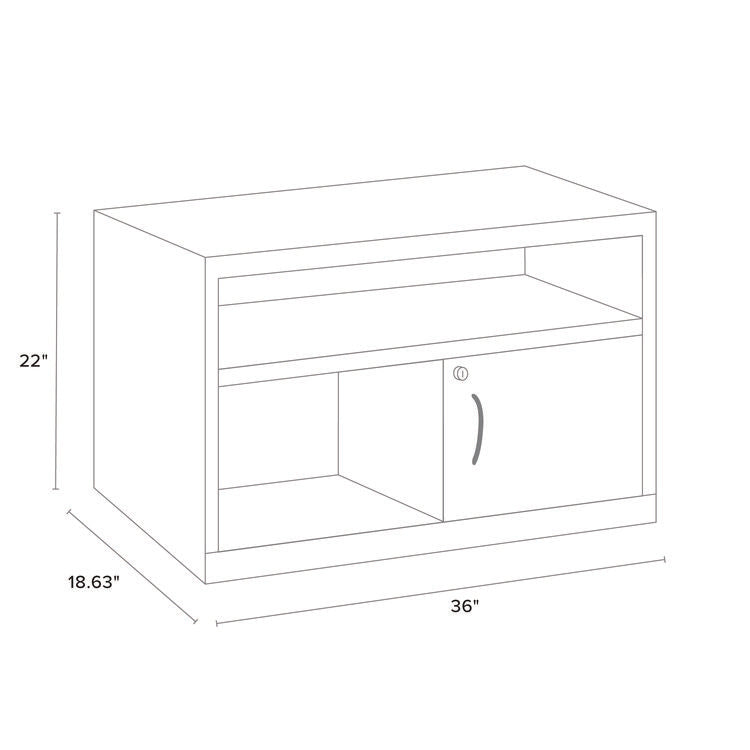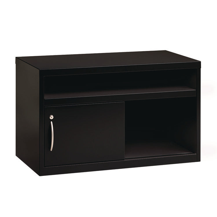 This sliding door commercial grade credenza cabinet is designed for heavy-duty use, yet looks great in any office. Features one fixed shelf and one shelf with a sliding door for concealed storage. The sliding door can be locked on either side. Credenzas make the perfect storage companion for open desk systems. Fully assembled steel construction with reinforced base. Non-porous surface is easy to clean. Unit includes four adjustable leveling glides. Color(s): Black; Color Family: Black; Overall Width: 36"; Depth (Max): 18.62".