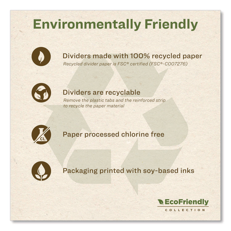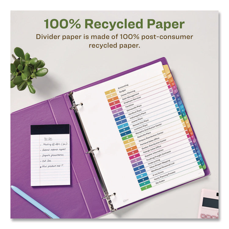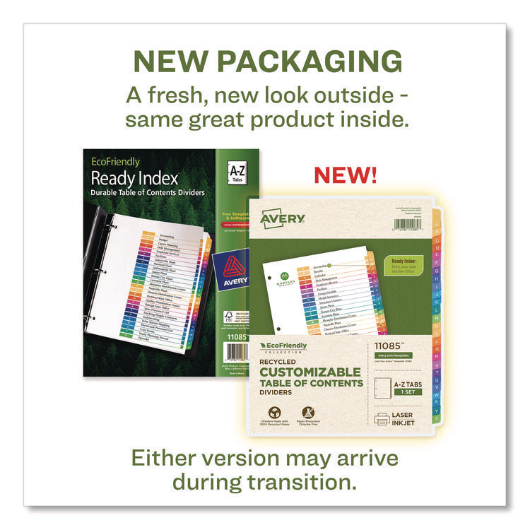 Organized documentation makes a business run like a well-oiled machine. These Ready Index Table of Contents Dividers help you stay organized so you can locate documents quickly and efficiently. They feature preprinted multicolor tabs that can be displayed in either landscape or portrait format. Using free templates from Avery Design & Print you can customize the included table of contents page and print in minutes. Organization and efficiency-makes life better for your business. For laser and inkjet printers. 100% Recycled. Index Divider Style: Alpha; Index Divider Size: 11 x 8.5; Punched/Unpunched: 3-Hole Punched; For Use With: Ring Binders.