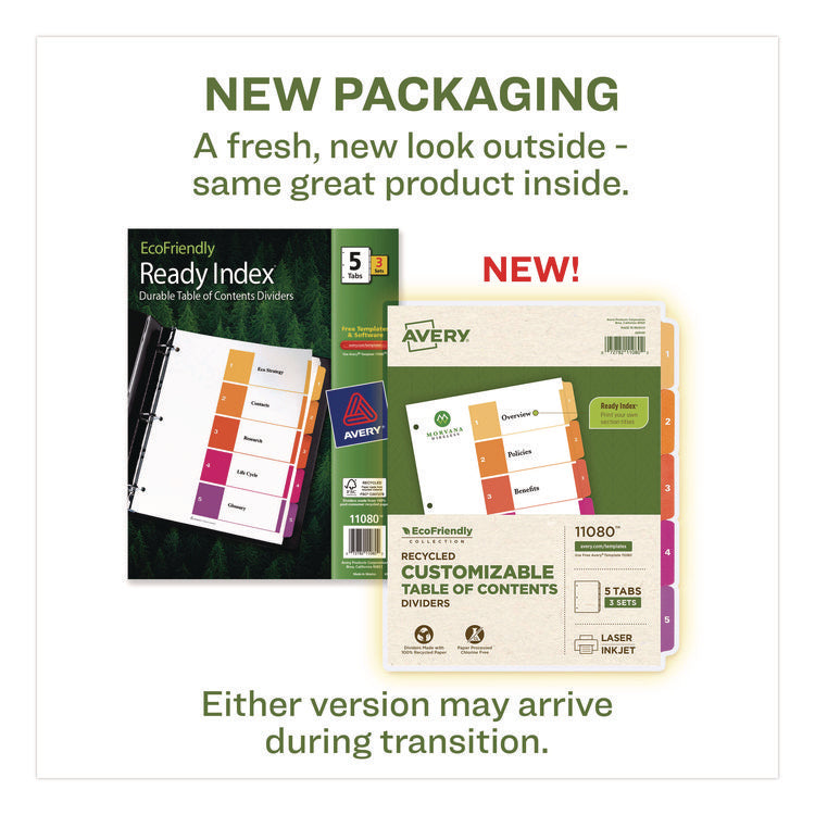 Organized documentation makes a business run like a well-oiled machine. These Ready Index Table of Contents Dividers help you stay organized so you can locate documents quickly and efficiently. They feature preprinted multicolor tabs that can be displayed in either landscape or portrait format. Using free templates from Avery Design & Print you can customize the included table of contents page and print in minutes. Organization and efficiency-makes life better for your business. For laser and inkjet printers. 100% Recycled. Index Divider Style: Arabic Numeric; Index Divider Size: 11 x 8.5; Punched/Unpunched: 3-Hole Punched; For Use With: Ring Binders.