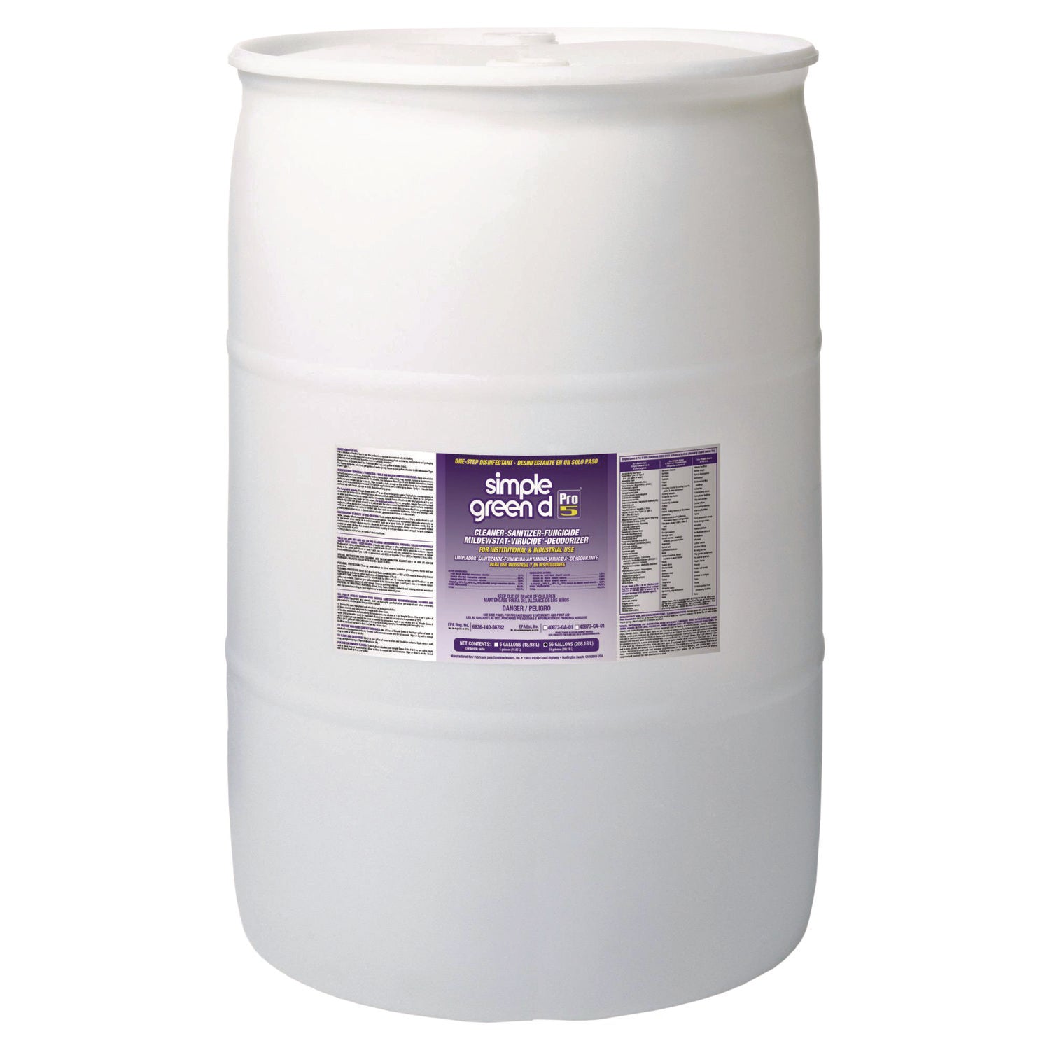 Simple Green d PRO 5 concentrated cleaner, deodorant, disinfectant, sanitizer, fungicide mildewstat, virucide. For Institutional and Industrial use. Kills the coronavirus (SARS-Related Coronavirus 2) that causes COVID-19 and cold and flu virus on hard, non-porous, non-food surfaces when used as directed. Use in athletic facilities, bars and restaurants, bathrooms, business and office buildings, cafeterias, day care centers, food preparation areas, hotels, institutional kitchens, nursing homes, pet animal quarters, public restrooms, schools and colleges, USDA inspected food processing facilities, and more. Application: Disinfectant/Cleaner; Applicable Material: Ceramics; Enamel; Fiberglass; Laminates; Metal; Plastic; Porcelain; Stainless Steel; Tile; Chemical Compound: Quaternary Ammonium Chloride; Dirt Types: Bacteria; Dust; Fungus; Germs; Mildew; Mold; Viruses; Water-Based Soil.