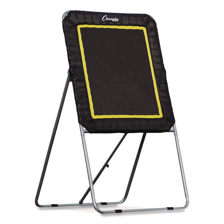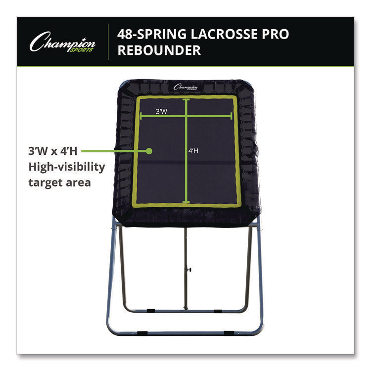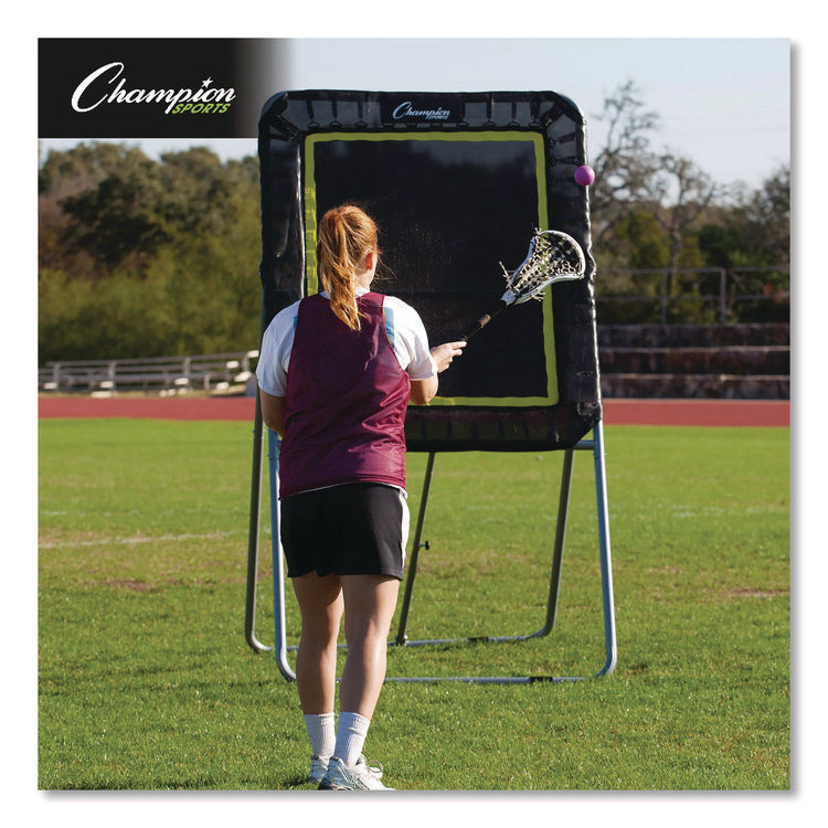 Designed to help hone a player's lacrosse skills, the Champion Sports Deluxe Lacrosse Ball Rebounder features a rebound target on an adjustable frame, allowing players to practice their passing and shooting from multiple angles. The dampened surface of the rebounder absorbs the shock of the pass or shot and rebounds the ball back to the player at any distance on both outdoor and indoor playing surfaces. Length: 6 ft; Width: 3 ft; Diameter: 1.5" dia; Material(s): Steel; Nylon.