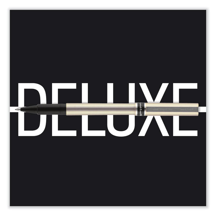 Introduce sophisticated style to your everyday writing with Deluxe Rollerball Stick Pens from uni-ball featuring a strong, long lasting tip. Even-flowing, acid-free liquid ink delivers a smooth writing experience for intense, vibrant lines. Deluxe delivers crisp lines with unparalleled definition, making it easy to create super fine details in your drawings and diagrams. Capped roller pens are useful for a variety of tasks from note taking and list making to signing checks and legal documents. Innovative uni Super Ink technology forms a strong bond with the paper, protecting from water, fading and fraud. Up your writing instrument sophistication with the matte black, brushed steel barrel of the Deluxe capped rollerball pens. Pen Sub-Brand & Product Family: Deluxe; Pen Type: Rollerball Pen; Pen Style: Stick; Pen Tip Type: Conical.