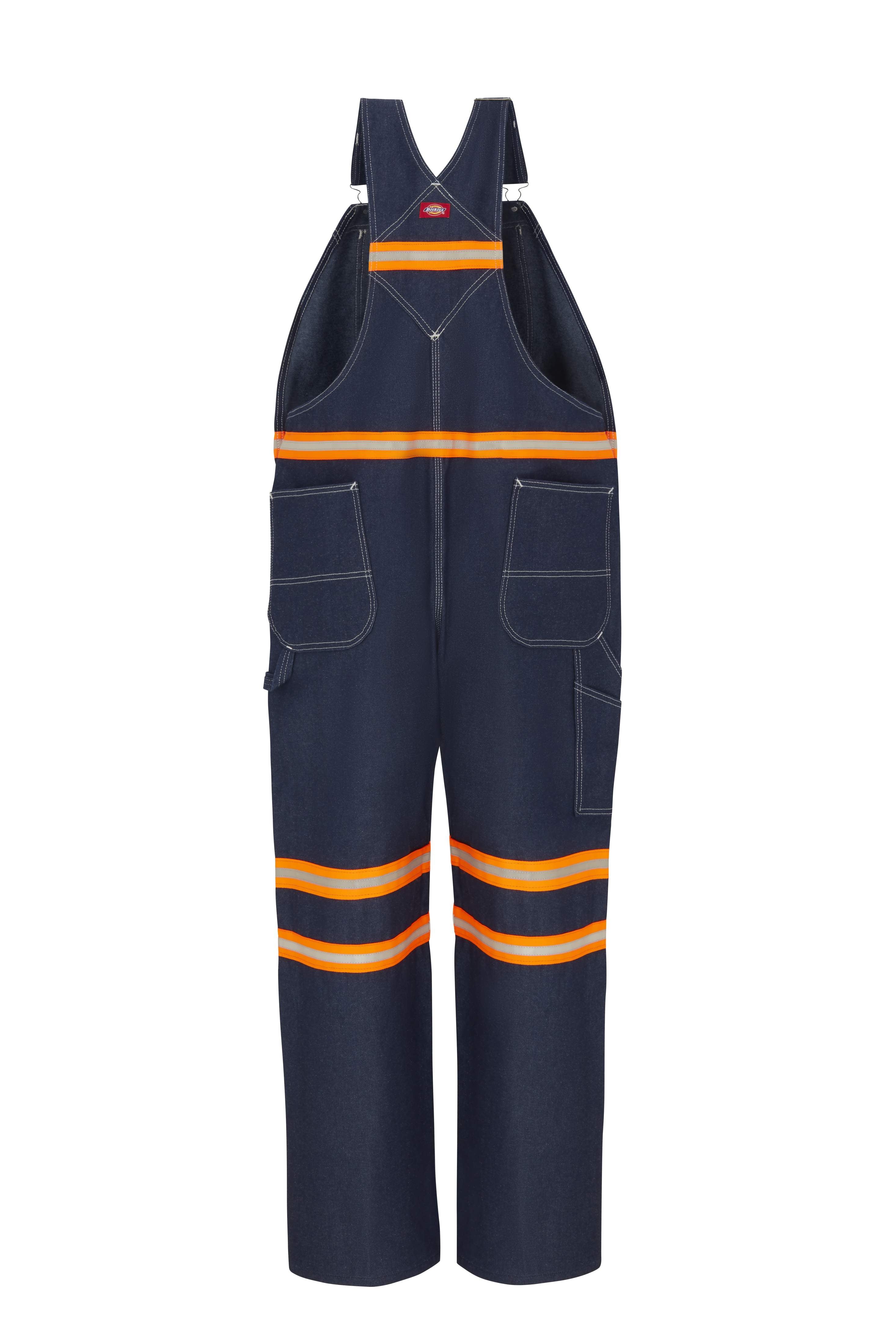 Dickies' Enhanced Visibility Denim Bib Overall utilizes 3M‚ Scotchlite‚ Reflective Material to keep you safe at night. The high-contrast orange trim is highly reflective and will make you known to anyone who passes. The denim design has a bib, watch pocket, double tool pocket, hammer loop and large bib pocket with pencil division. The triple-stitched seams add to the durability of this overall‚ giving you confidence in working the late shift.