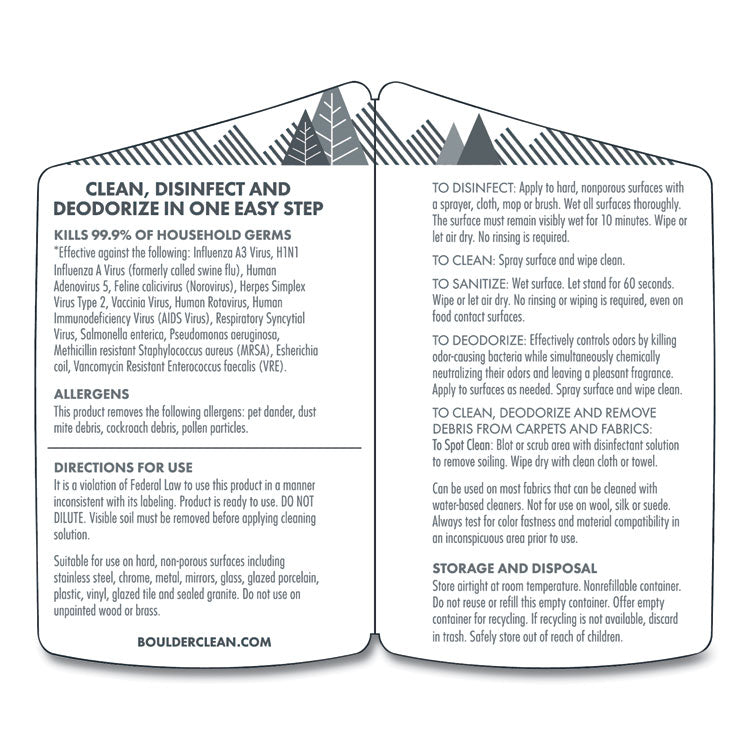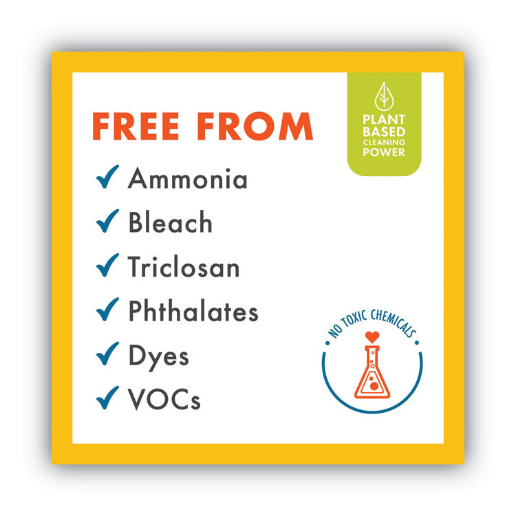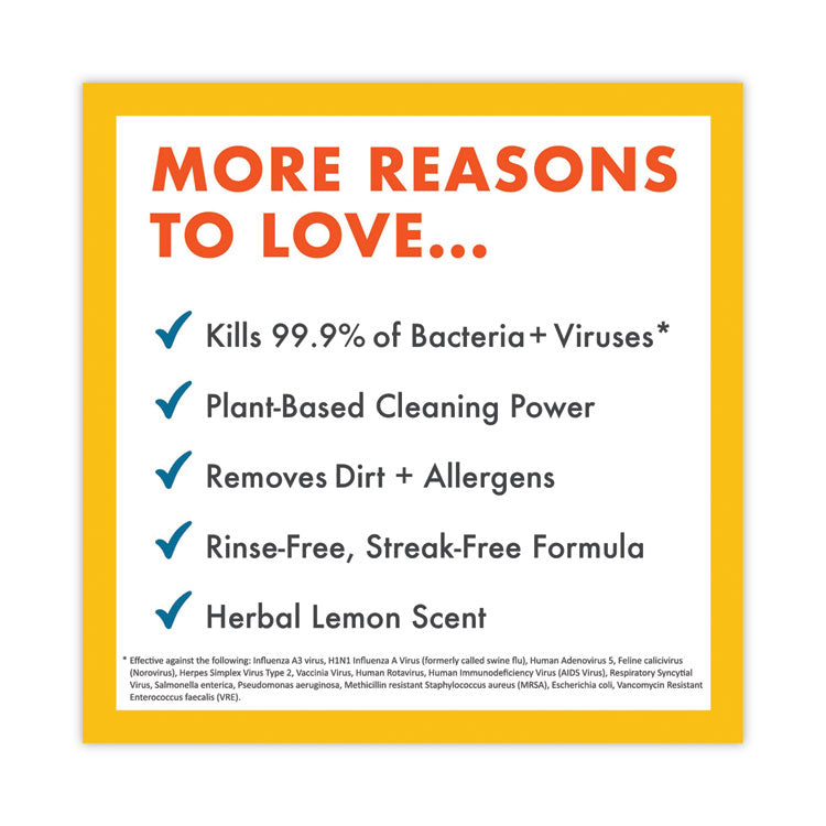 Multitasking at its best! This disinfectant cleans, deodorizes and disinfects in one easy step. No need to rinse, even on food contact surfaces and children's toys. Ready-to-use formula requires no mixing. The active ingredient Thymol kills cold and flu viruses on hard, non-porous surfaces and eliminates 99.9% of household germs and allergens. It dries streak-free and leaves no residue. Free from harsh chemicals, this plant-powered lemon scented formula is safe to use around kids and pets. Application: Disinfectant/Sanitizer; Applicable Material: Chrome; Glass; Glazed Porcelain; Glazed Tile; Hard Non-Porous Surfaces; Metal; Mirrors; Plastic; Sealed Granite; Stainless Steel; Vinyl; Chemical Compound: Water; Thymol; Citric Acid; Pelargonic Acid; TEA-Lauryl Sulfate; Ammonium C6-10-alkyl Polyoxyethylene Sulfate; Hexylene Glycol; Isopropanol; Lemon Fragrance; Dirt Types: Allergens; Bacteria; Cockroach Debris; Dust Mite Debris; Eshericha Coil; Feline Calicivirus; Herpes Simplex; Household Dirt; Human Immunodeficiency Virus; Human Rotavirus; Influenza A3; Methicillin Resistant Staphylococcus Aureus (MRSA); Pet Dander; Pollen Particles; Pseudomonas Aeruginosa; Respirator Syncytial Virus; Salmonella Enterica; Vancomycin Resistant Enterococcus Faecalis; Viruses.