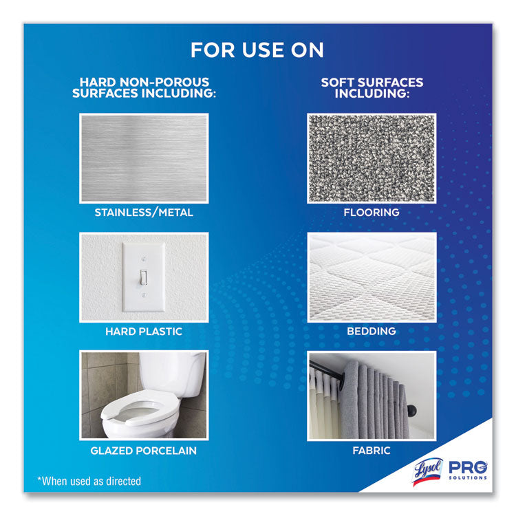 Get maximum versatility with minimal effort with Lysol Disinfectant Spray that's safe to use on hard and soft surfaces. Lysol kills 99.9% of viruses and bacteria, including the virus that causes COVID-19 in 15 seconds, as well as cold and flu viruses when used as directed. Help protect high-traffic areas and high-touch surfaces, including desks, bathrooms, doorknobs, and railings. Deliver hospital-type disinfection on to soft surfaces, including upholstery, curtains, sofas, mattresses, and cushions. Meet customer and staff expectations around disinfection. Simply spray and let air dry. Application: Disinfectant/Sanitizer; Applicable Material: Hard, Non-Porous Surfaces; Chemical Compound: Ethanol, Alkyl (50% C14, 40% C12, 10% C16) Dimethyl Benzyl Ammonium Saccharinate; Dirt Types: Bacteria; Fungus; Germs; Mildew; Mold; Viruses.