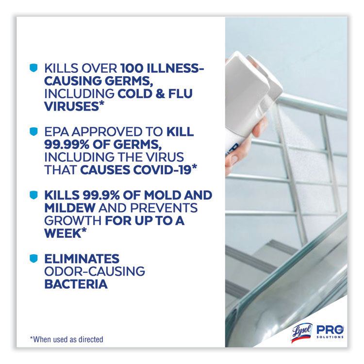 Get maximum versatility with minimal effort with Lysol Disinfectant Spray that's safe to use on hard and soft surfaces. Lysol kills 99.9% of viruses and bacteria, including the virus that causes COVID-19 in 15 seconds, as well as cold and flu viruses when used as directed. Help protect high-traffic areas and high-touch surfaces, including desks, bathrooms, doorknobs, and railings. Deliver hospital-type disinfection on to soft surfaces, including upholstery, curtains, sofas, mattresses, and cushions. Meet customer and staff expectations around disinfection. Simply spray and let air dry. Application: Disinfectant/Sanitizer; Applicable Material: Ceramics; Enamel; Fiberglass; Laminates; Metal; Plastic; Vinyl; Chemical Compound: Ethanol; Alkyl (50% C14, 40% C12, 10% C16) Dimethyl Benzyl Ammonium Saccharinate; Dirt Types: Bacteria; Fungus; Germs; Mildew; Mold; Viruses.